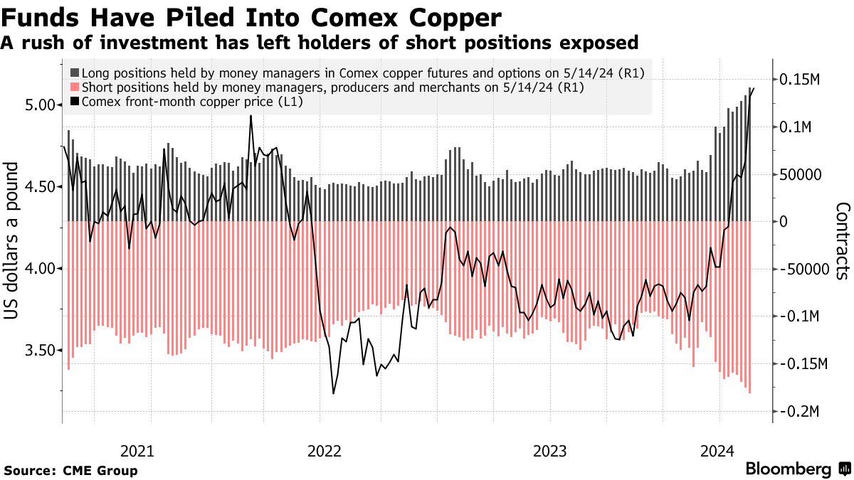 铜飙升至历史最高水平,延续了数月的涨势,这是由金融投资者推动的,他们纷纷涌入市场,预期供应短缺将加剧。铜矿石供应紧缺引发了有关冶炼厂削减产量的讨论,投资者押注,快速增长的电动汽车、可再生能源和人工智能等新兴领域的用量将抵消传统行业如建筑业的拖累。