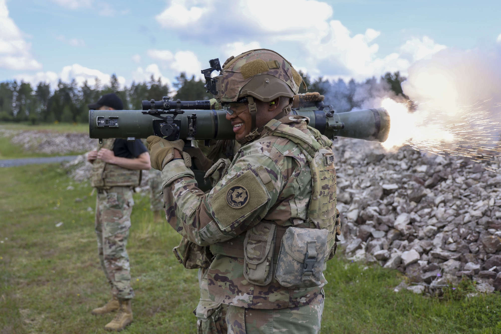 一名美国陆军士兵在德国格拉芬韦尔美军训练基地举行的重型武器领导人课程期间,使用卡尔古斯塔夫8.4厘米无后座力炮进行实弹射击,时间为5月23日。