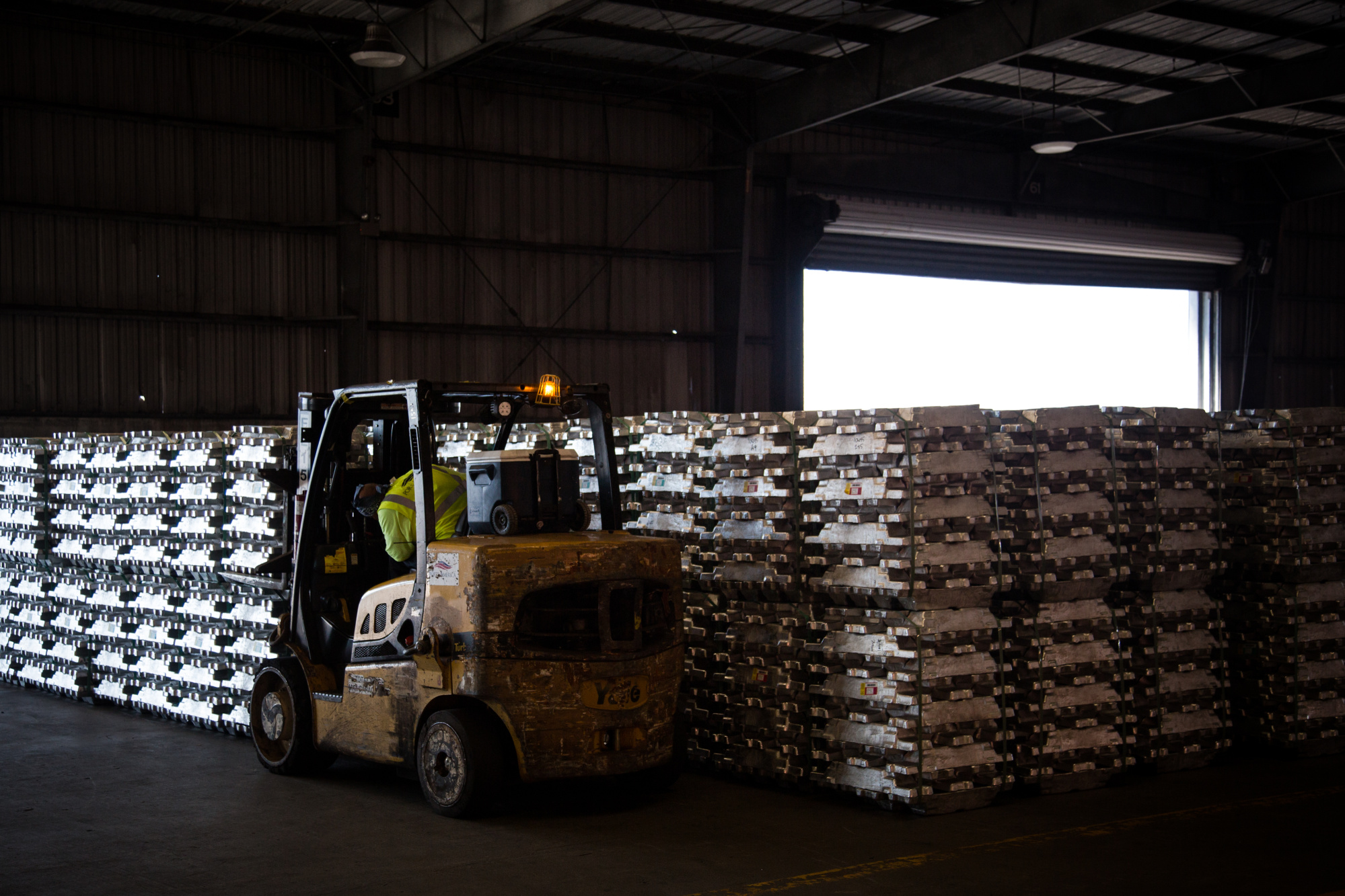 一名工人在美国港口的仓库里使用叉车移动铝锭。摄影师:Alex Flynn/Bloomberg