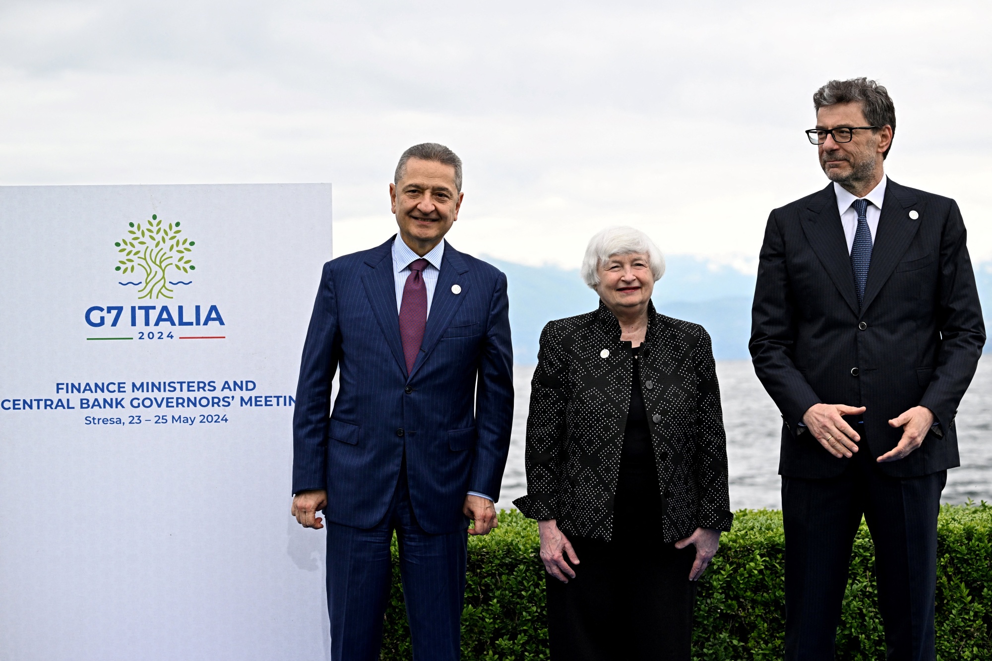 Fabio Panetta, Janet Yellen, Giancarlo Giorgetti在意大利斯特雷萨(Stresa)于5月24日。摄影师:Gabriel Bouys/AFP/Getty Images