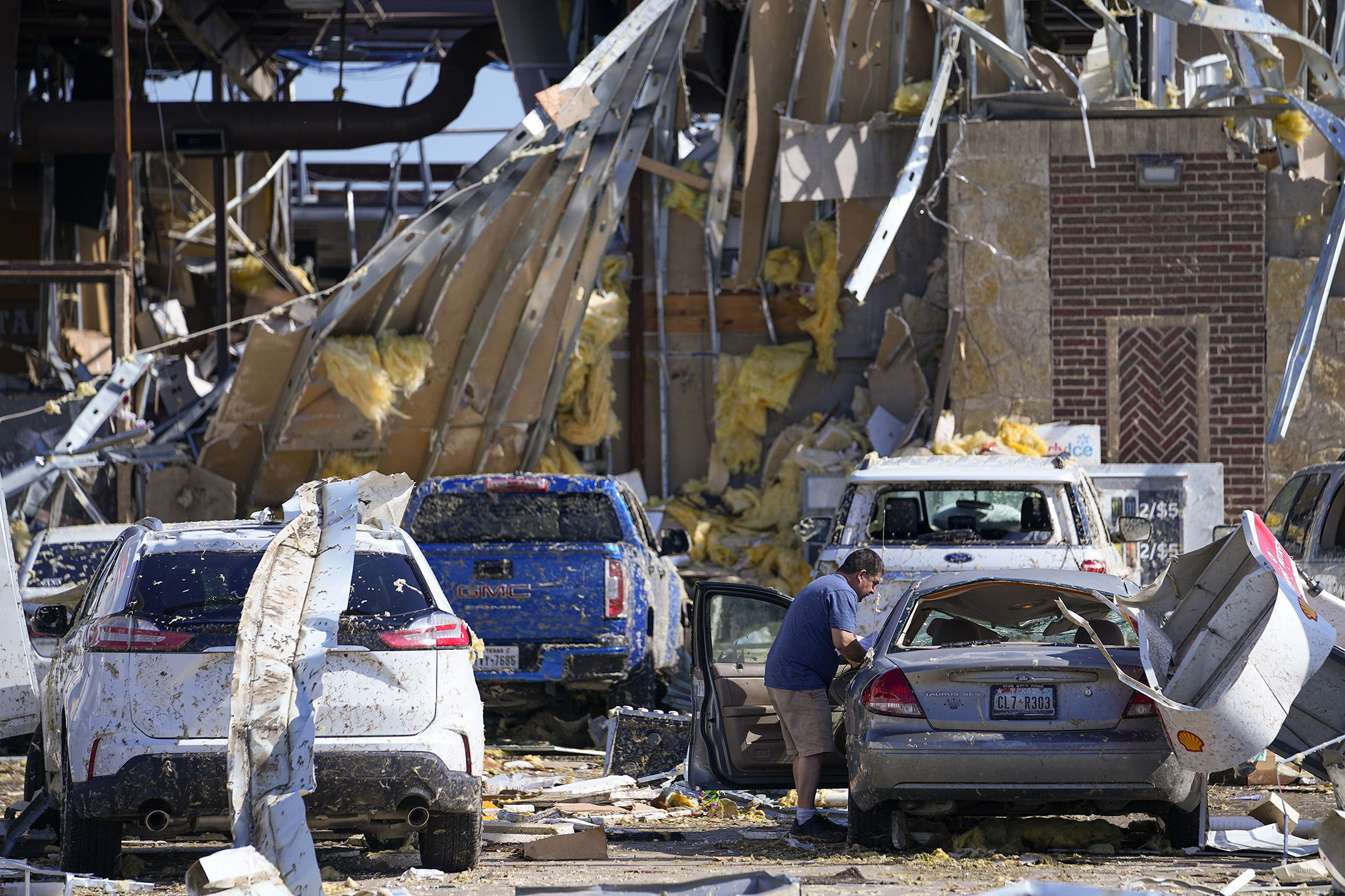 一名居民在得克萨斯州瓦利维尤的一家卡车停车场的浴室里度过龙卷风后,从他的车辆中收集物品,日期为5月26日。摄影师:朱利奥·科尔特斯/AP照片