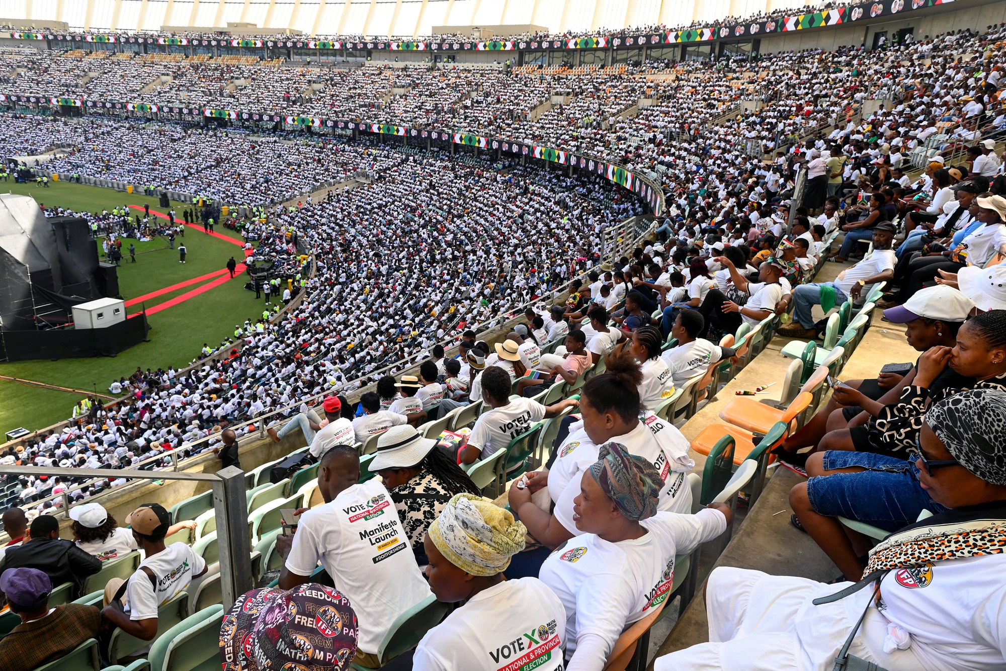 南非港口城市德班的56,000座摩西·马比达体育场挤满了人群,为执政党非洲人国民大会的选举宣言发布会揭幕。