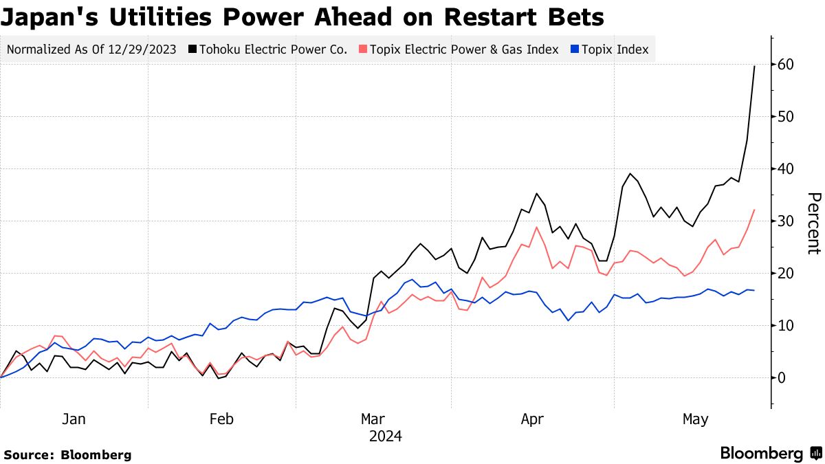 电力公司的一个衡量指标是更广泛的Topix指数中表现最佳,而Topix在早盘交易中下跌。该指数今年已上涨约32%,表现优于Topix指数,得到日本加速重启核反应堆计划的支持,以及预期需求将因该国在半导体生态系统中扮演的日益重要角色而增加。