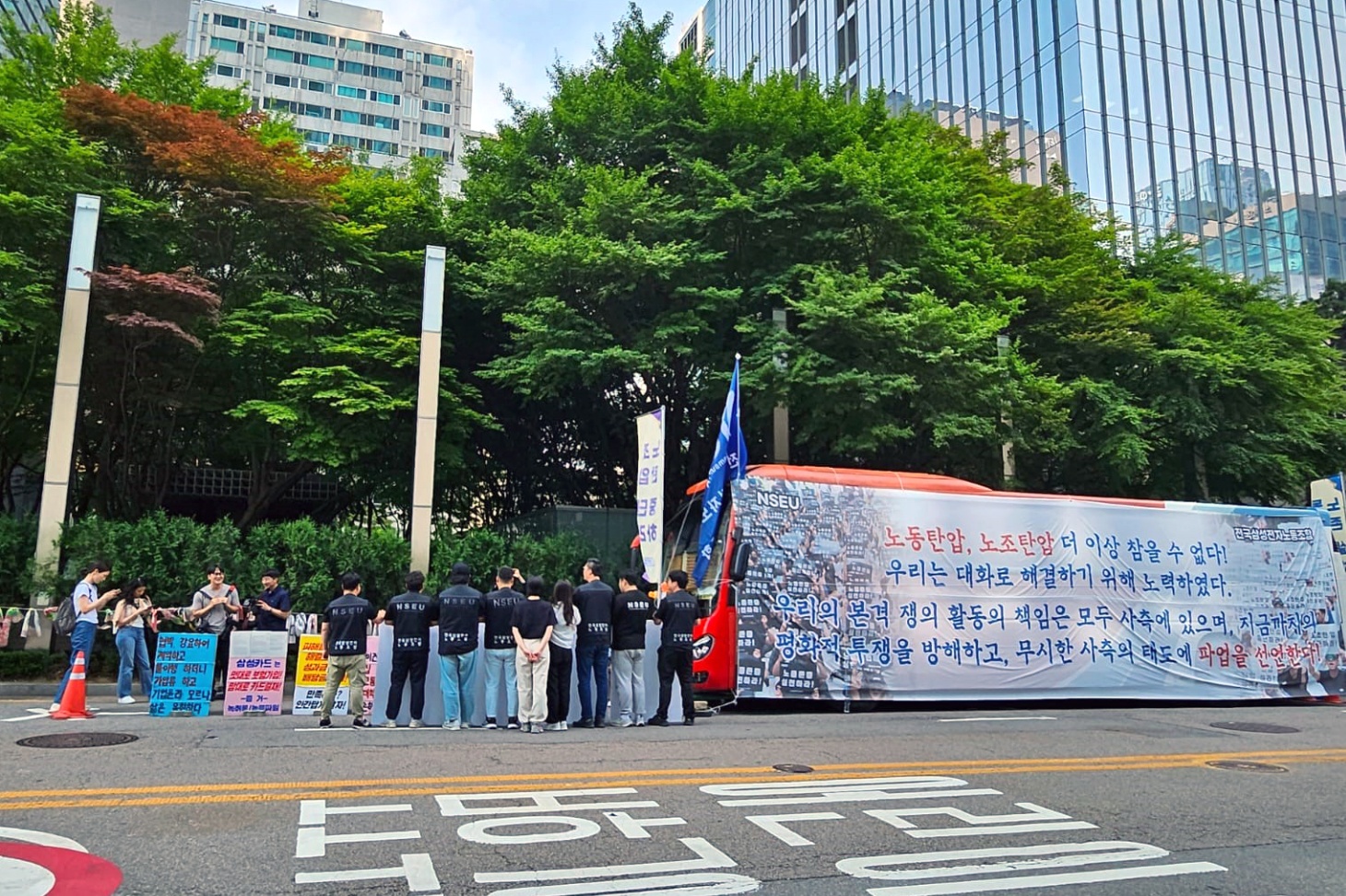 一辆带有横幅的公共汽车停在首尔三星办公大楼前,日期为6月7日。台湾立法者通过了一项可能削弱新任总统赖清德权威的立法,成千上万的抗议者聚集在议会外反对这些改变。