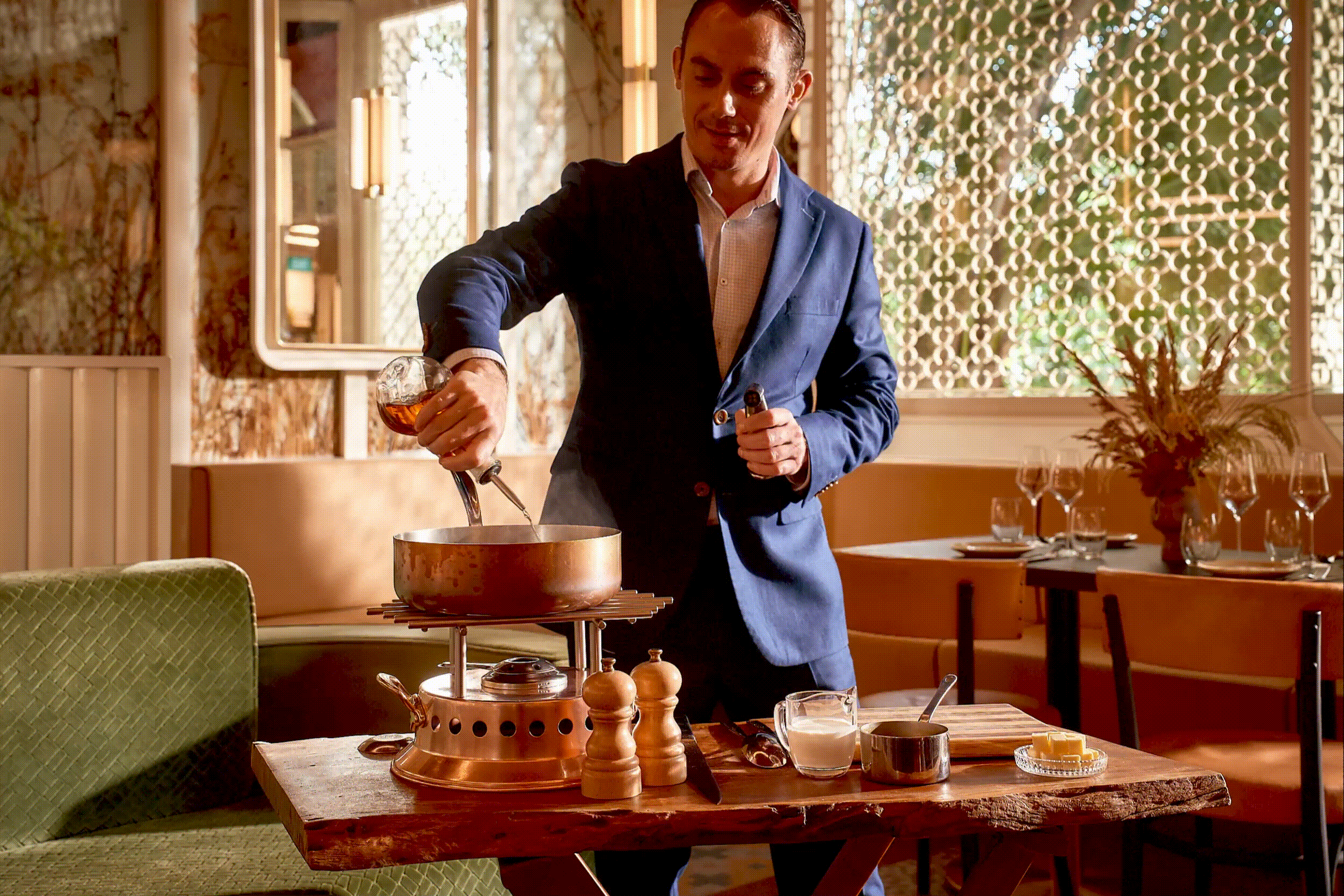 在法国餐厅Claudine,有一道现场制作的Crêpes Suzette变奏曲。来源:Claudine如果我不是在1880主持晚间活动,我会去28 Hong Kong Street,这是新加坡酒吧界的一个机构,享受一两杯应得的下班鸡尾酒。我总是点canarinio—巴西甘蔗烈酒、椰子、百香果、香蕉、酸橙和多香料。当我有朋友或家人来访时,我经常带他们去登比,这是英国留下的老军营,现在是我最喜欢的晚餐地点之一。通常我们会去Claudine,那里供应典型的法国美食(必点coq au vin!),或者去Tuga,我喜欢的一切葡萄牙风味。