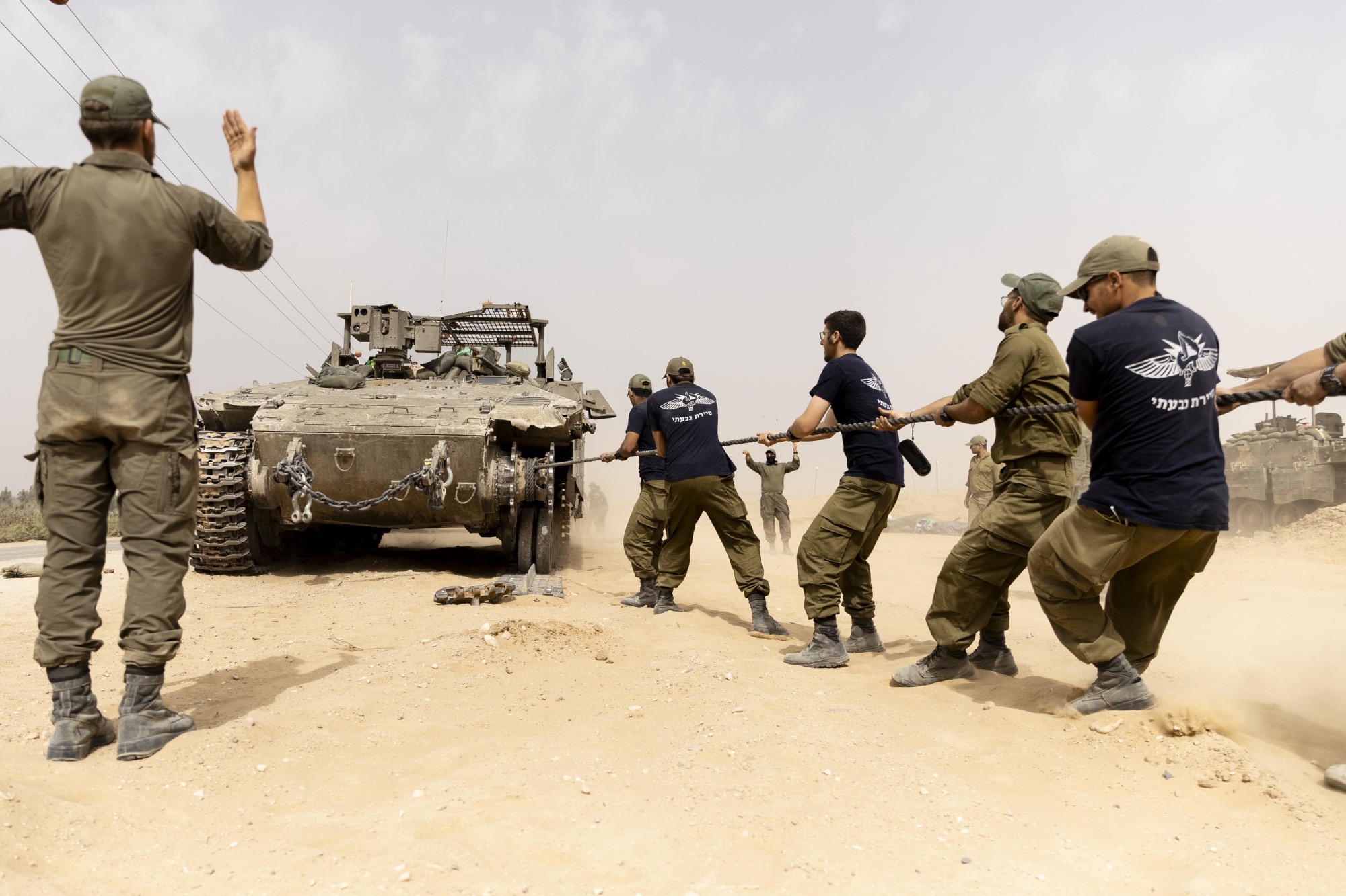 以色列士兵在加沙地带南部边境附近指挥一辆装甲人员车辆。