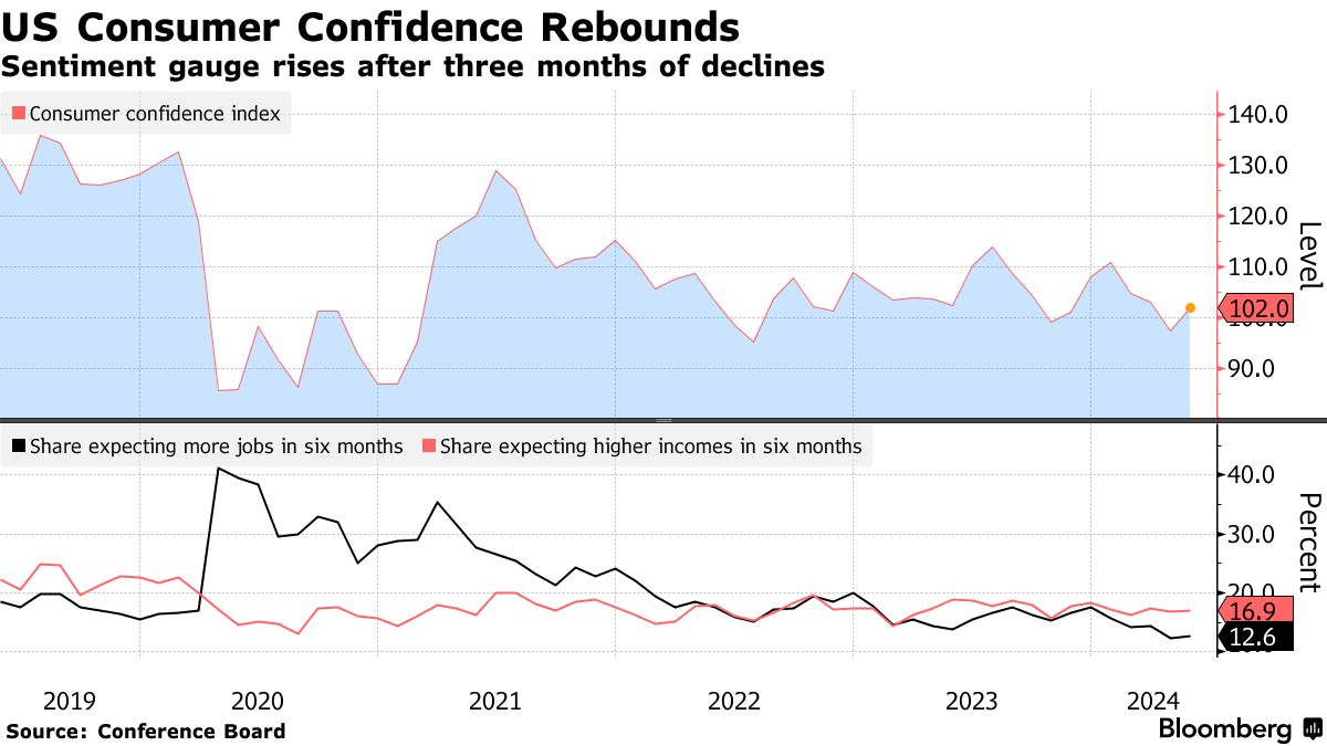 根据周二公布的数据,美国研究会(The Conference Board)的情绪指数从4月的上调后的97.5上升到102。这一数据超过了经济学家在彭博调查中的所有预测。