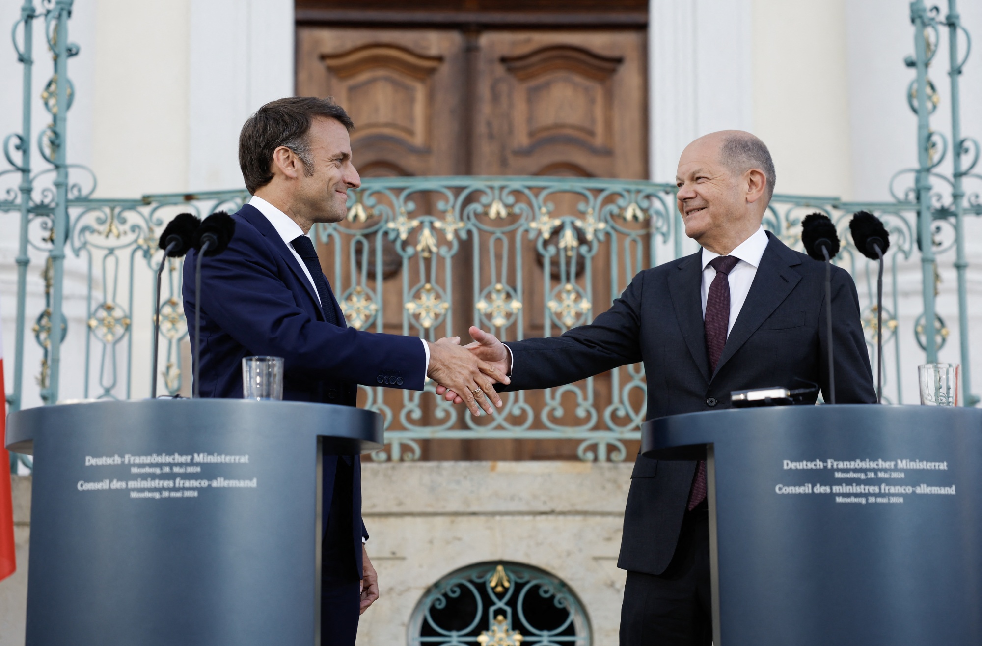 埃马纽埃尔·马克龙和奥拉夫·肖尔茨在德国梅泽贝格宫举行联合新闻发布会后握手,时间为5月28日。
