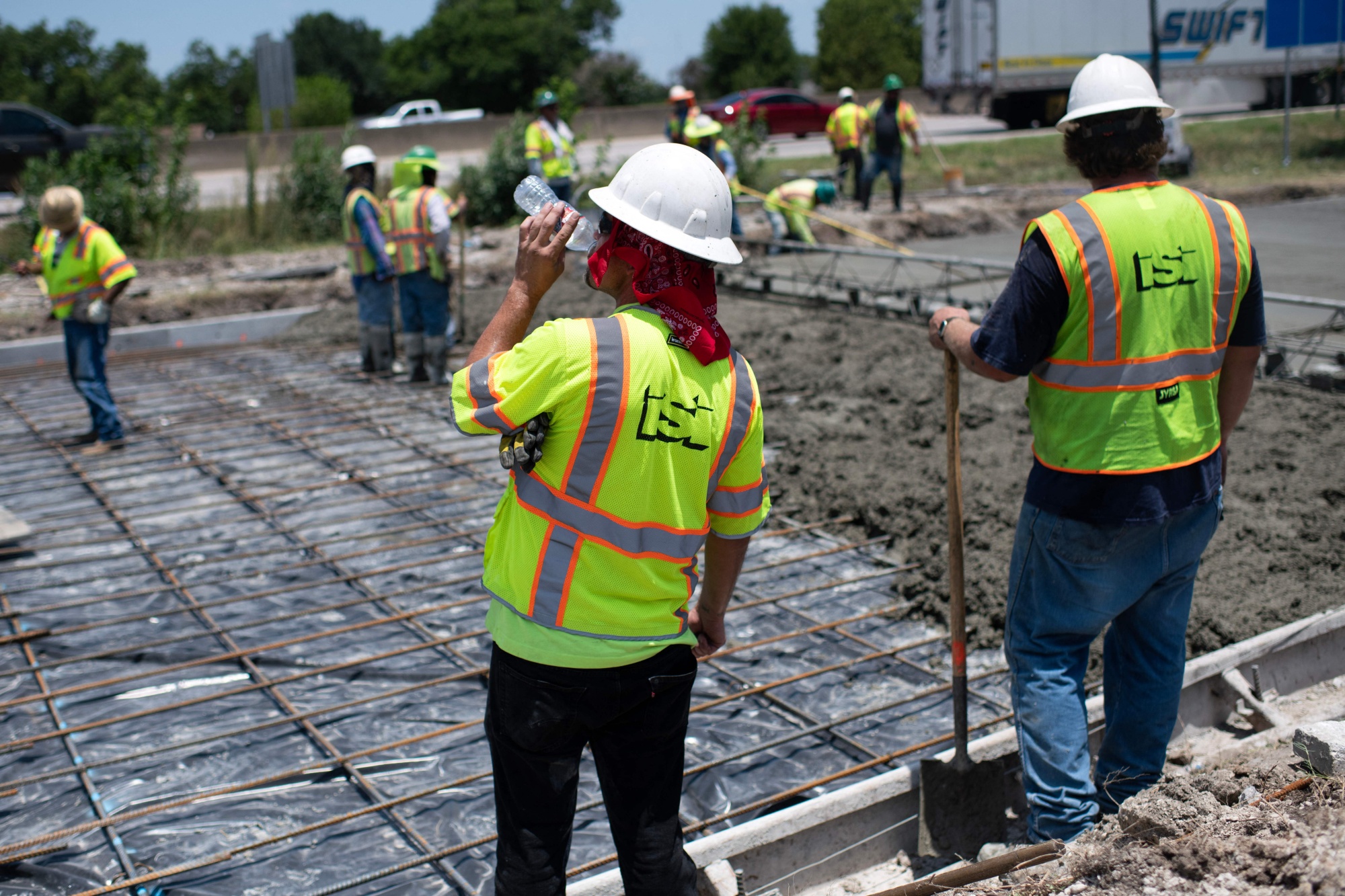 一名建筑工人在德克萨斯州休斯敦修路时,在6月27日的热浪中喝水。摄影师:马克·费利克斯/法新社/盖蒂图片社根据旧金山联邦储备银行的一项研究,极端高温将通过限制建筑工人的生产力和减少资本投资来扼杀美国经济。