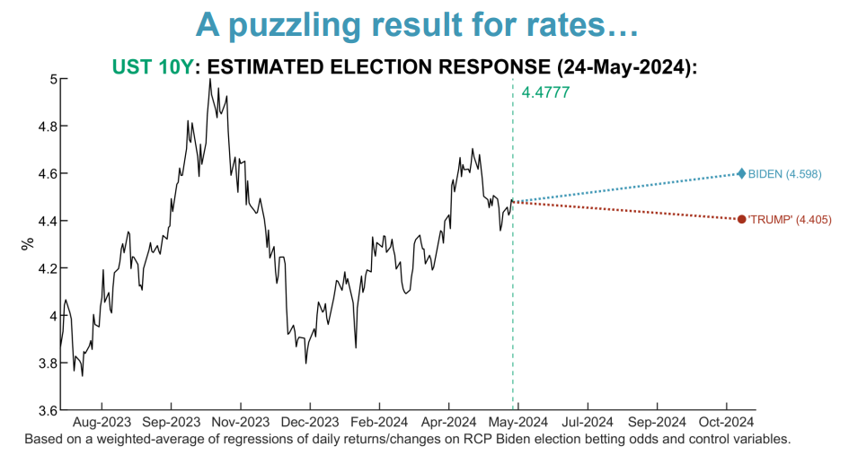来源:派普桑德勒来源:派普桑德勒派普桑德勒策略师警告称,他们最新的研究建立在“强烈的假设和明显不完美的指标”之上。他们还表示,结果在过去一个月内发生了变化。四月份,他们的估计显示,如果特朗普获胜,10年期收益率将增加11个基点。