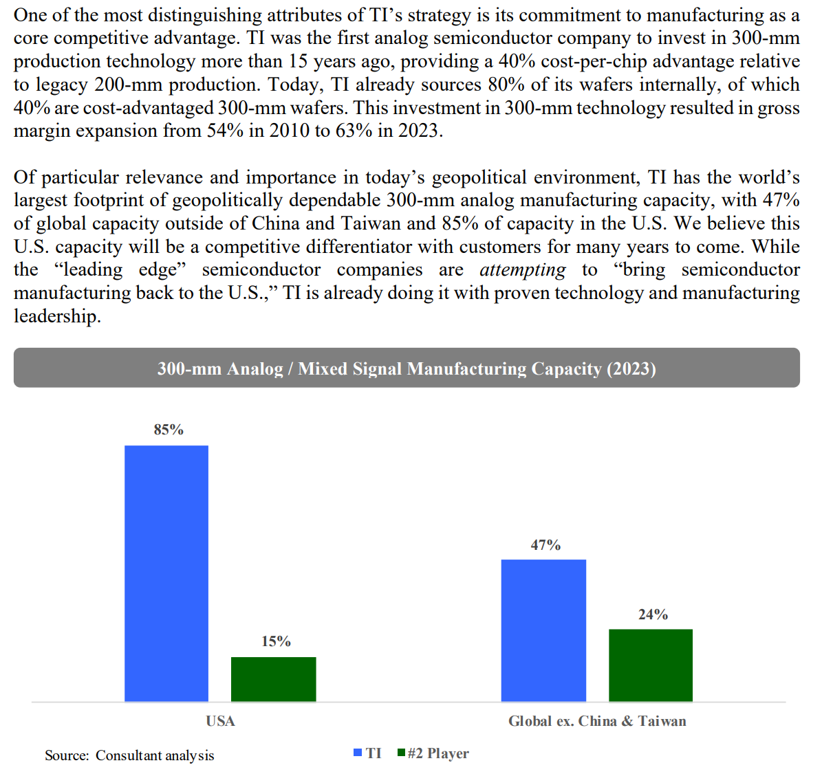 关于半导体的一个有趣之处在于,美国在Covid期间真正暴露了对进口的脆弱性和依赖性,例如,汽车制造商无法获得基本的芯片组件来制造汽车。不久之后,CHIPS法案出台,以鼓励美国在该行业的前沿进行制造。然而,那些缺失的汽车芯片并不是行业前沿的产品,而是更便宜、滞后、大众消费产品,这正是TI擅长的领域。从理论上讲,从地缘政治的角度来看,增加美国的产能将是一件好事。但正如艾略特所指出的,这在短期内是昂贵的,也许对股东不友好。因此,你有这两股相互竞争的力量:总体政策希望看到更多的美国制造 vs. 投资者希望最大化回报。需要明确的是,艾略特表示支持德州仪器利用自己的生产能力。以下是信中的一个关键部分: