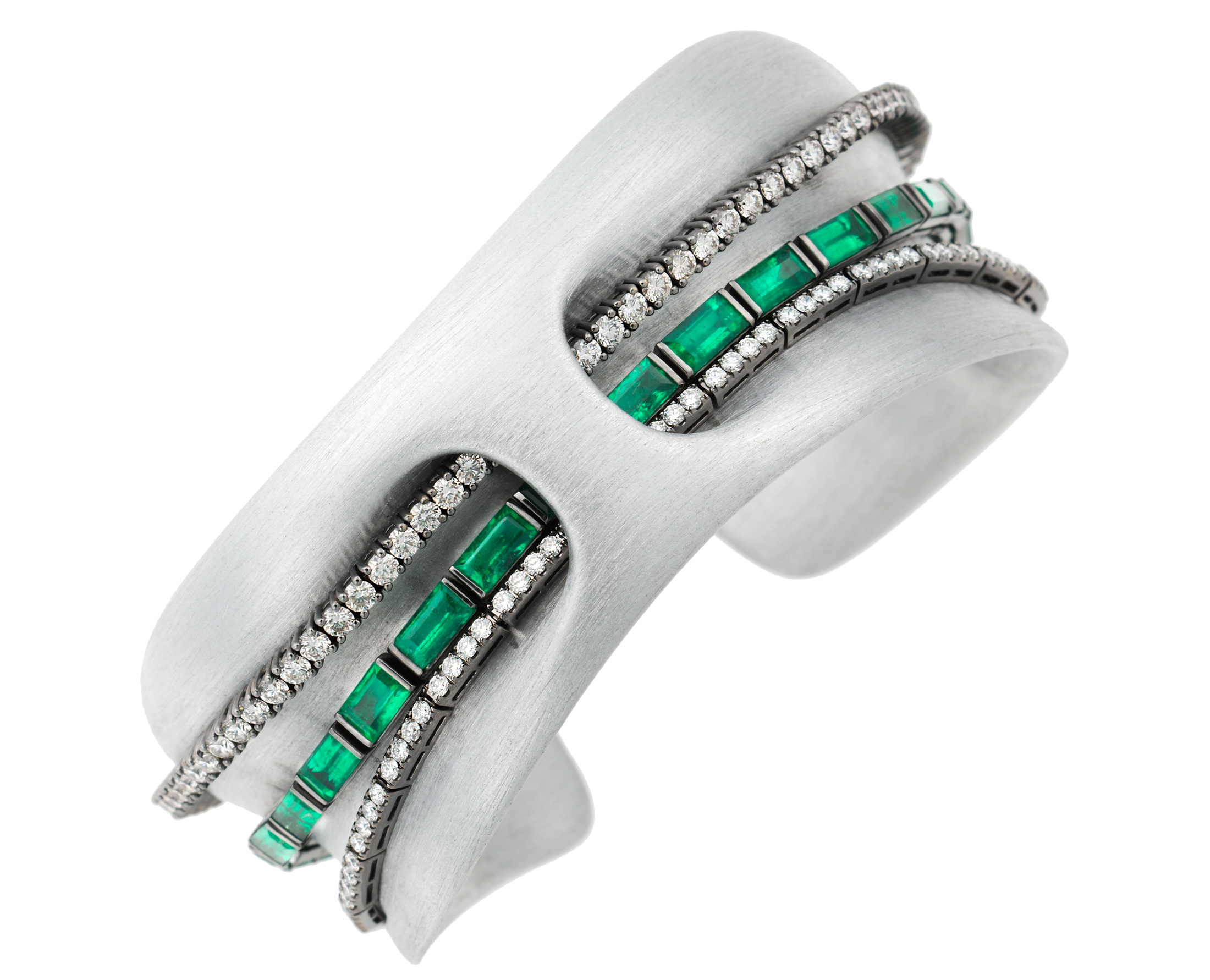 一枚价值147万美元的8克拉椭圆形钻石戒指。来源:Nikos Koulis他最新的系列作品,Me,于去年九月上市,摆脱了严谨的几何形态,包括更多有机形式。黄金吊耳环(54,960美元)上镶嵌的钻石沿着两侧延伸,几乎相遇在中间,仿佛在包裹黄金。一件多部分的前卫作品(82,000美元)使用弯曲的刷铝手镯作为背景,配以两条钻石网球手镯和一条由祖母绿制成的手镯。“没有人知道他接下来会做什么”,Shanker说到这个出乎意料的转变。“是他的能量在改变,当他的能量改变时,系列也在演变。”