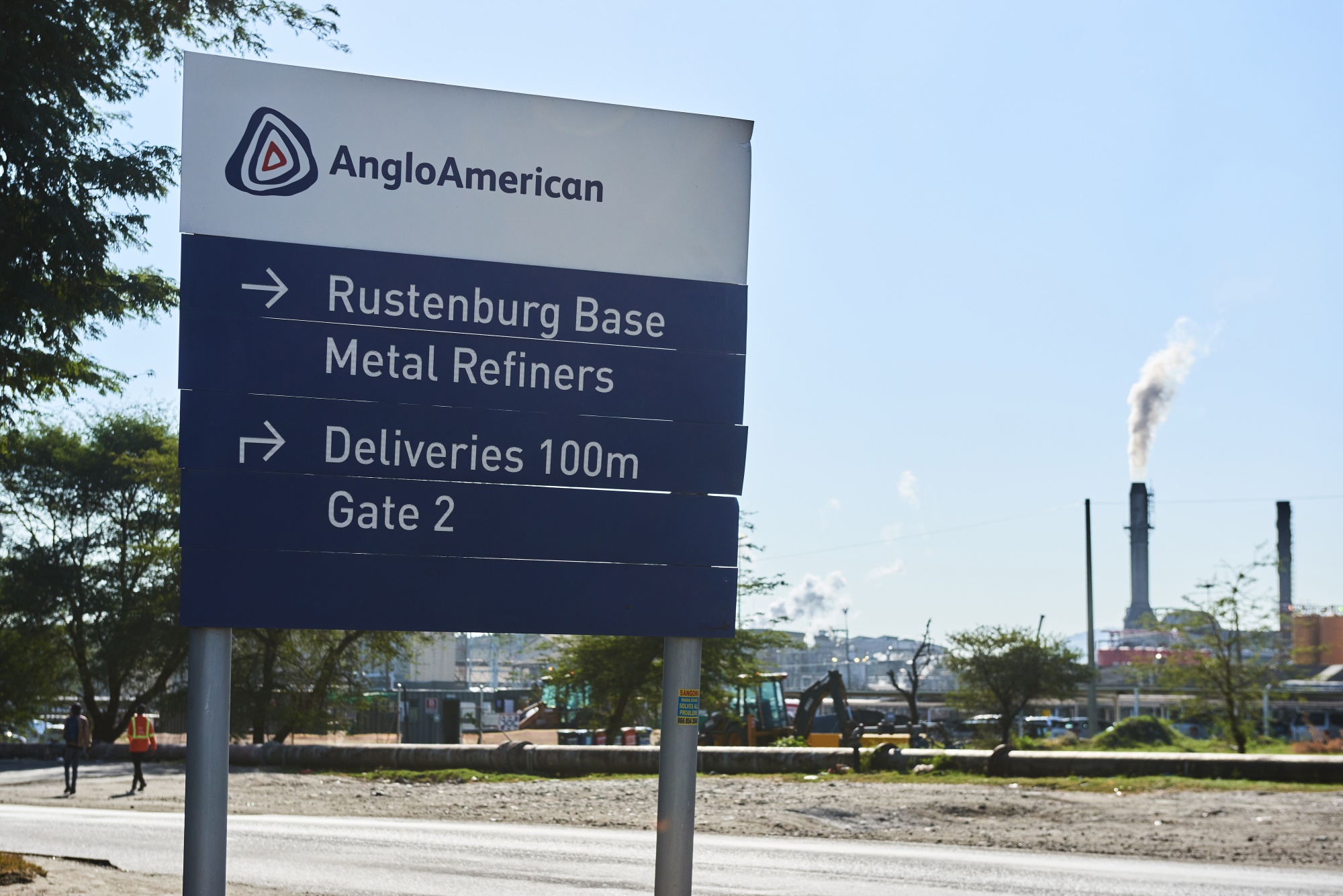 在南非的Rustenburg外,由英美白金有限公司运营的Waterval冶炼厂指示前往Rustenburg基地金属精炼厂的标志