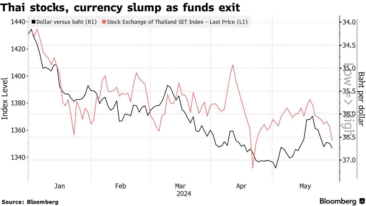 泰国经济已经因为去年选举后陷入僵局而推迟2024年预算付出了代价,导致1月至3月季度增长率降至1.5%,是东南亚同行中最低的。政治不稳定可能会延迟2025年预算的议会批准。增长下滑到1.5%,是东南亚同行中最低的。政治不稳定可能会延迟2025年预算的议会批准。