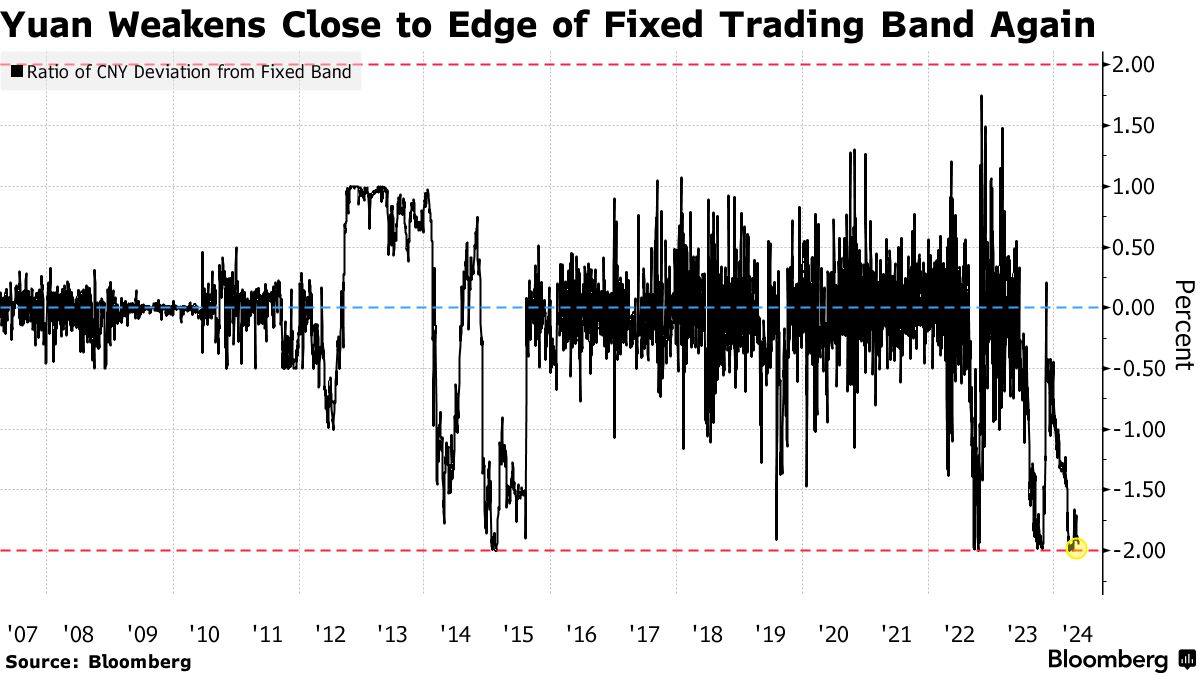 这些押注导致本周抛售加速,人民币跌至触及去年11月以来的最低点,并且距离交易区间的弱端只有一步之遥。
