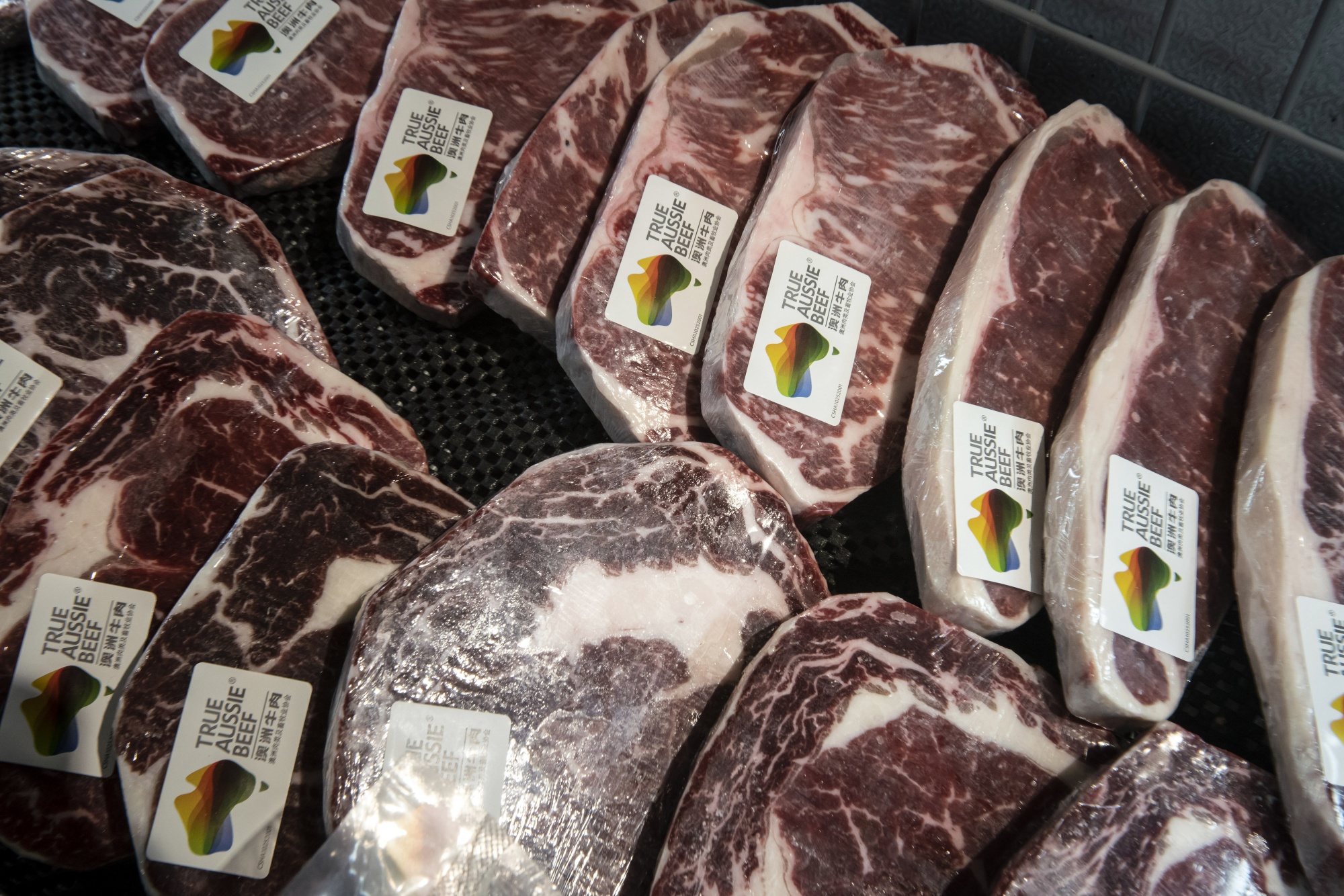 上海一家欧乐超市的进口澳大利亚牛肉包。摄影师:Qilai Shen/Bloomberg五家澳大利亚主要牛肉生产商被禁止向中国出口肉类,最新举措将允许它们立即恢复贸易,这是北京为了正常化与堪培拉的经济关系而采取的最新举措。