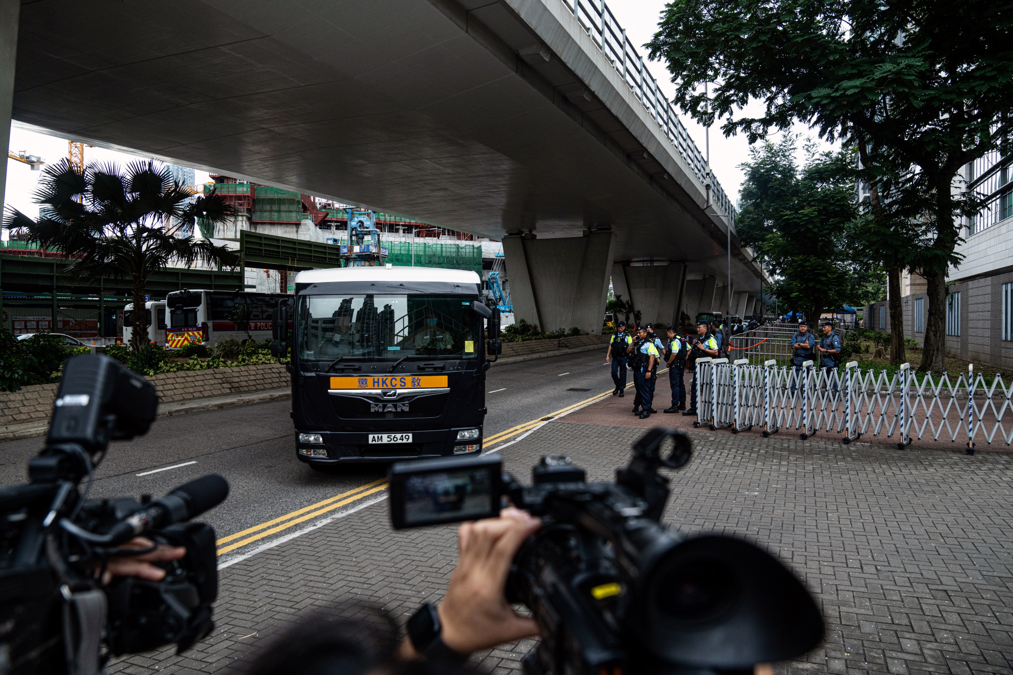 一辆澳门西九龙裁判法院的澳门特别行政区惩教车辆抵达法院,准备听取判决。摄影师:Lam Yik/彭博社接受判决的这16名被告是47名被控密谋颠覆国家政权的人中的一部分,他们通过举行非官方初选被指控。其余人之前已认罪,包括知名活动人士黄之锋和前立法委员毛孟静。被判有罪者最高面临终身监禁的刑罚,并将在以后的日期被判刑。
