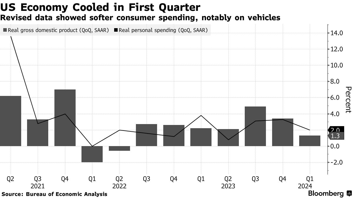 2024年第一季度美国国内生产总值:经济增长速度放缓,支出、通货膨胀下调 - 彭博社