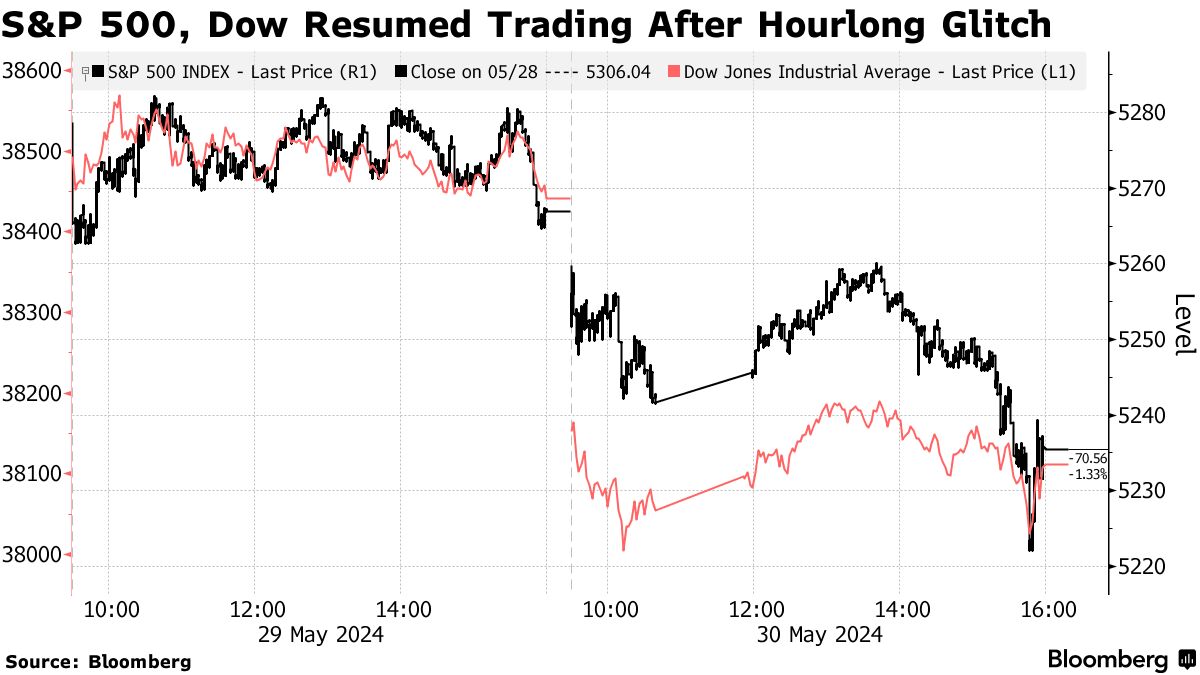 道琼斯工业平均指数也遭遇了同样的中断,尽管恢复时间稍早。在现金交易时段内似乎没有出现进一步问题。标普500指数当天收盘下跌了0.6%,道琼斯指数下跌了0.9%。