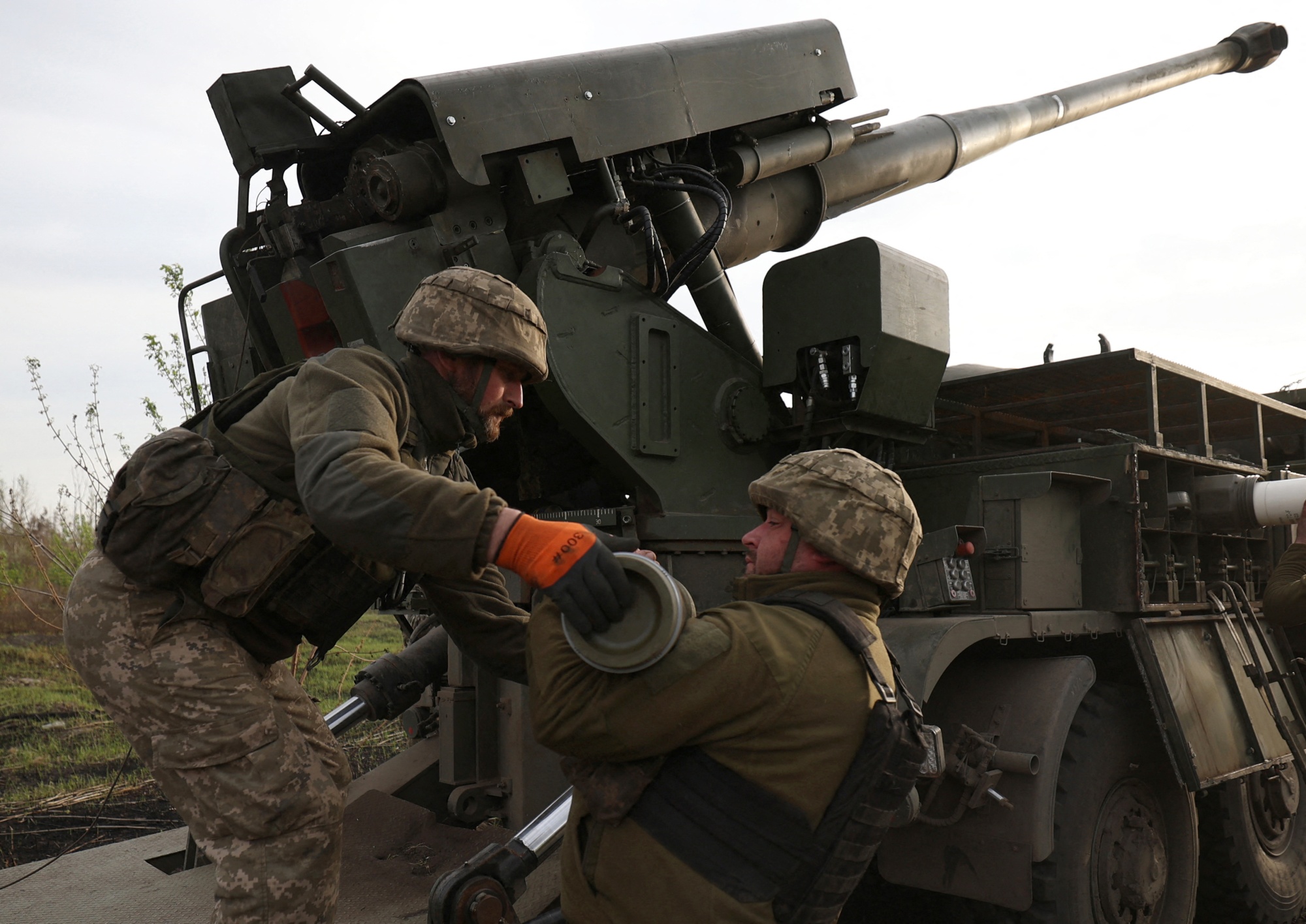 炮手们在哈尔科夫地区用榴弹炮向俄罗斯阵地开火。