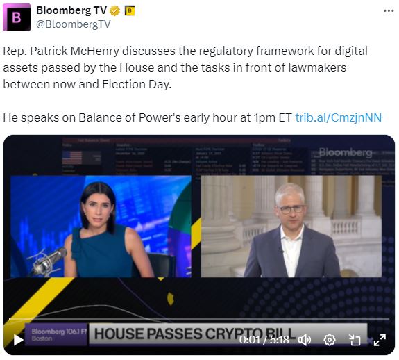今天在彭博电视台的权力平衡早间版节目中,主持人乔·马修和凯利·莱因兹采访了众议院金融服务委员会主席帕特里克·麦克亨利,谈到众议院通过的数字资产监管框架以及选举日前议员们面临的任务。