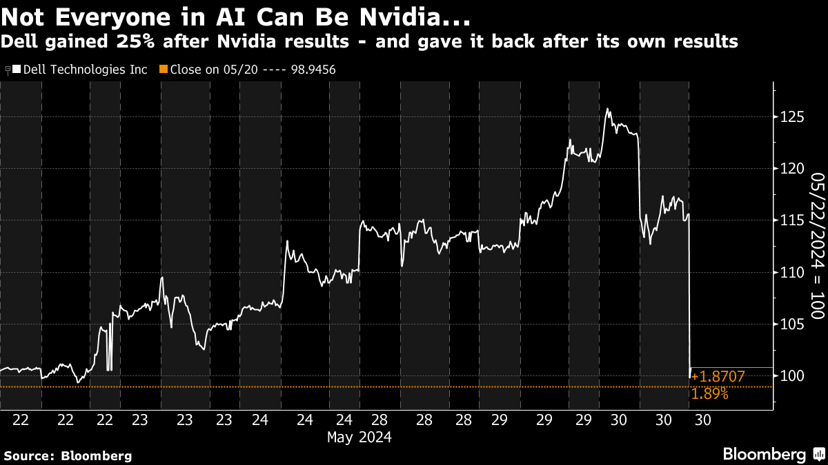 戴尔科技公司刚刚发布了一条关于试图从英伟达公司非凡表现推断出人工智能增长前景的风险的消息。戴尔是一家领先的能够处理人工智能的服务器制造商。在英伟达一周前的业绩公布后,其股价飙升了25%。然而在该公司周四盘后公布自己的业绩后,这一涨幅完全被抹去: