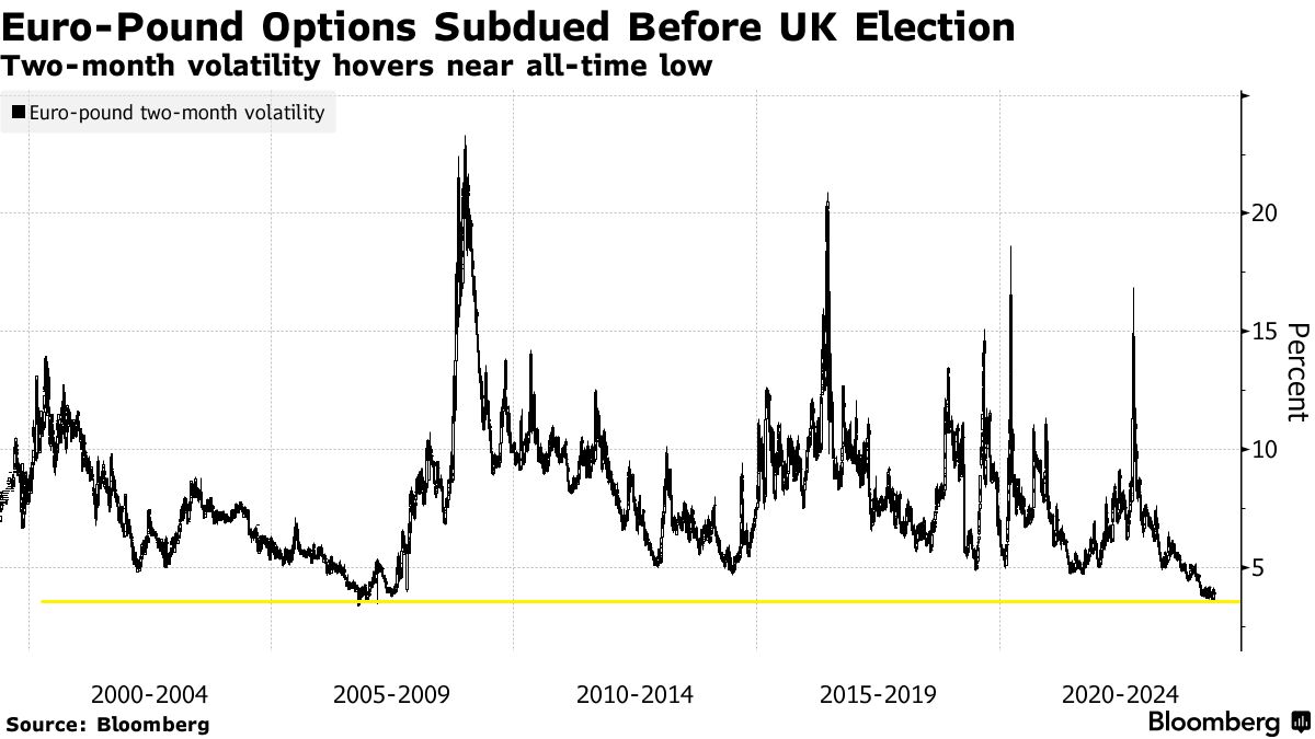 市场当前舒适水平的一个标志是波动率指标,显示英镑对欧元未来两个月的波动预期接近18年来的最低水平。