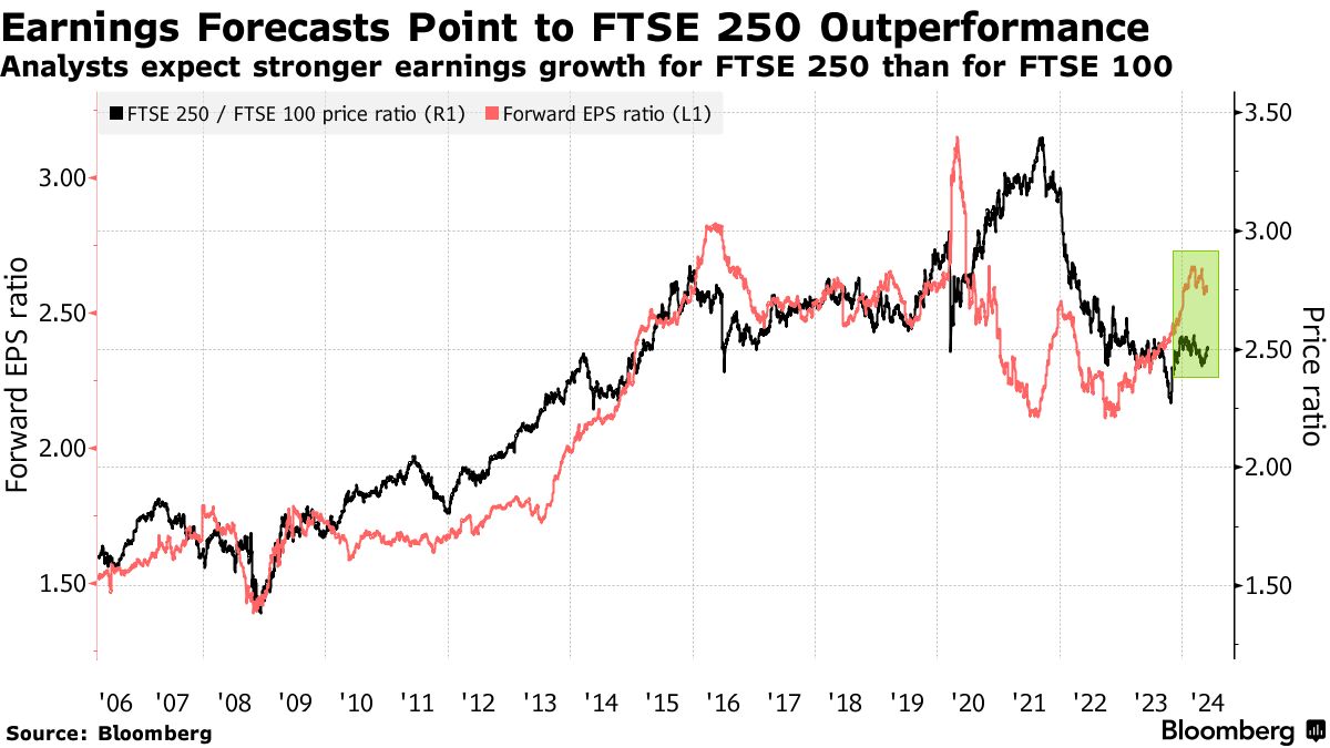 策略师指出,主要由国内关注的股票组成的富时250指数有望在英镑走强的背景下表现优于出口为主的富时100指数。强劲的货币通常会对像英国石油公司和壳牌公司这样在外国市场赚钱的公司的销售产生压力,同时降低那些主要从本地收入中获利的公司的成本。