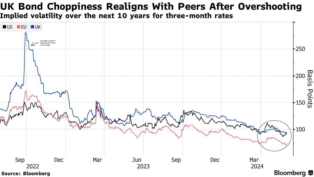 英国债券市场的波动性正在与大型同行重新调整,这是在选举前一直在美国和欧洲利率市场中持续超过的前首相利兹·特拉斯于2022年底发布迷你预算后的情况。