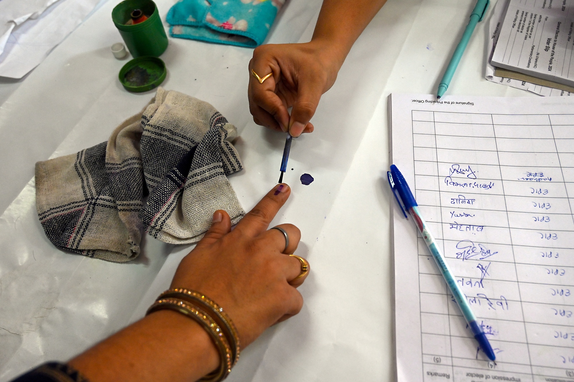 一名选举官员在德里的一个投票站使用不可磨灭的墨水标记选民的手指。