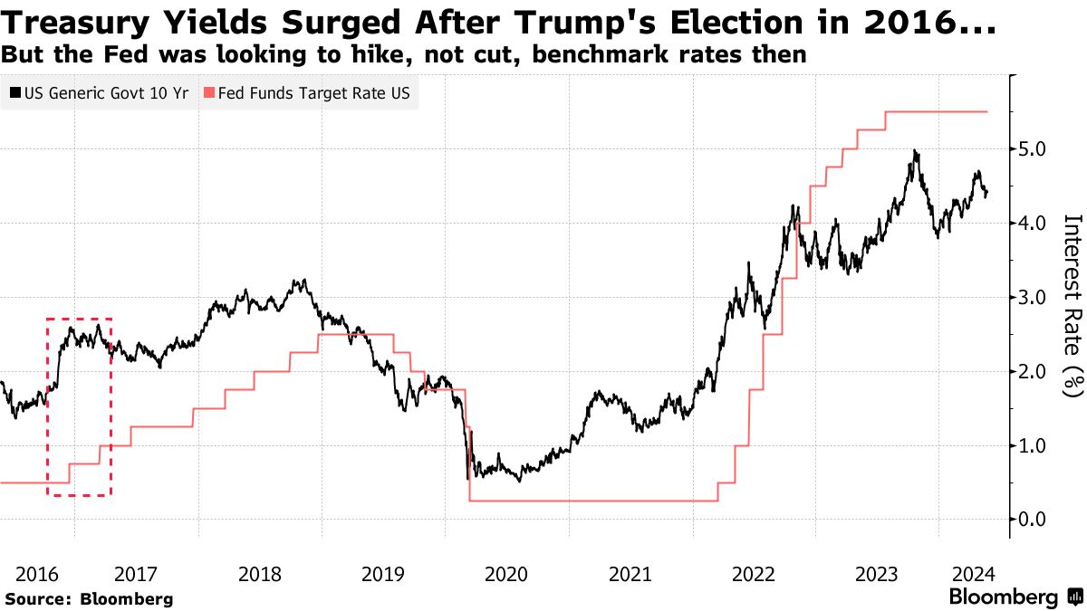 这增加了重演2016年情景的风险,当时特朗普意外当选导致债券收益率飙升,预期他的减税政策将迫使美联储加息。在特朗普任期的大部分时间里,央行确实提高了借贷成本。