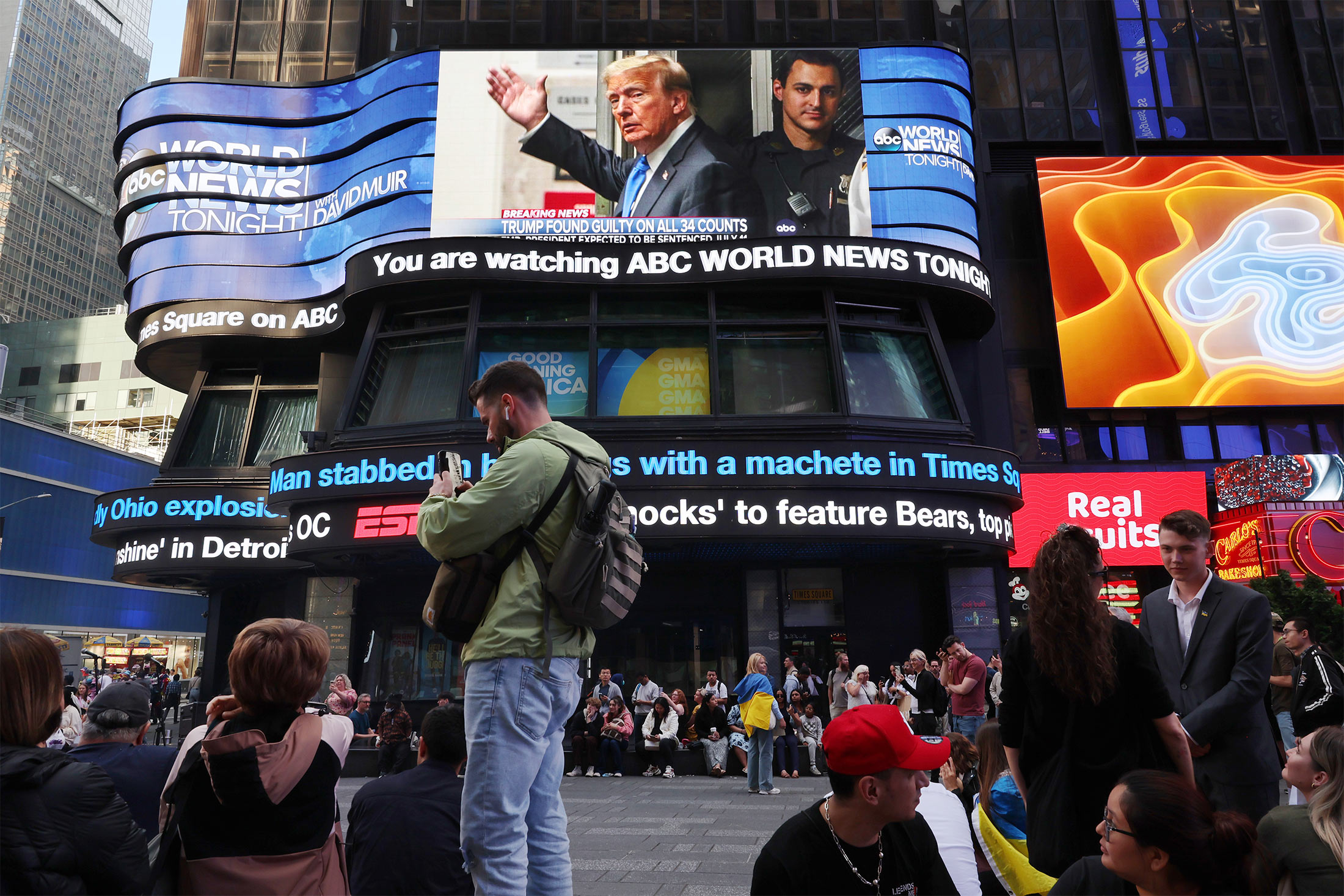 屏幕显示唐纳德·特朗普在纽约时代广场的保密金审判中被定罪的新闻,日期为5月30日。