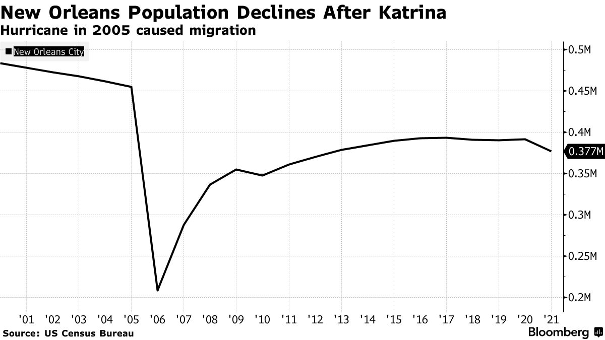 严重天气曾经引发城市大规模外迁。例如,美国新奥尔良在2005年卡特里娜飓风后,人口急剧减少 — 这些数字从未恢复到21世纪初的水平。随着气候变化增加了世界各地洪水和火灾的数量和强度,更多人可能被迫搬迁。问题是:搬到哪里?