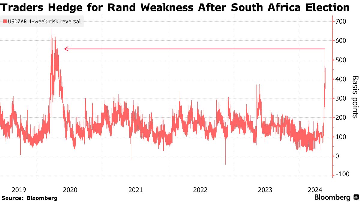 对事态发展方向的不确定性削弱了南非资产。自最初的预测显示非国大党将失去议会多数席位以来,兰特已贬值2.5%。债券和股票也出现抛售。