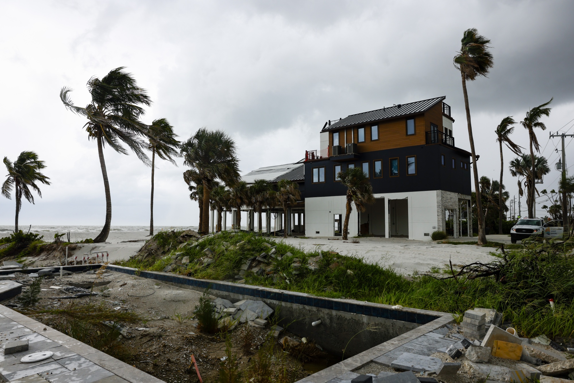 2023年8月29日,飓风伊恩袭击佛罗里达州迈尔斯海滩后,一座抗飓风的房屋旁边的受损游泳池。
