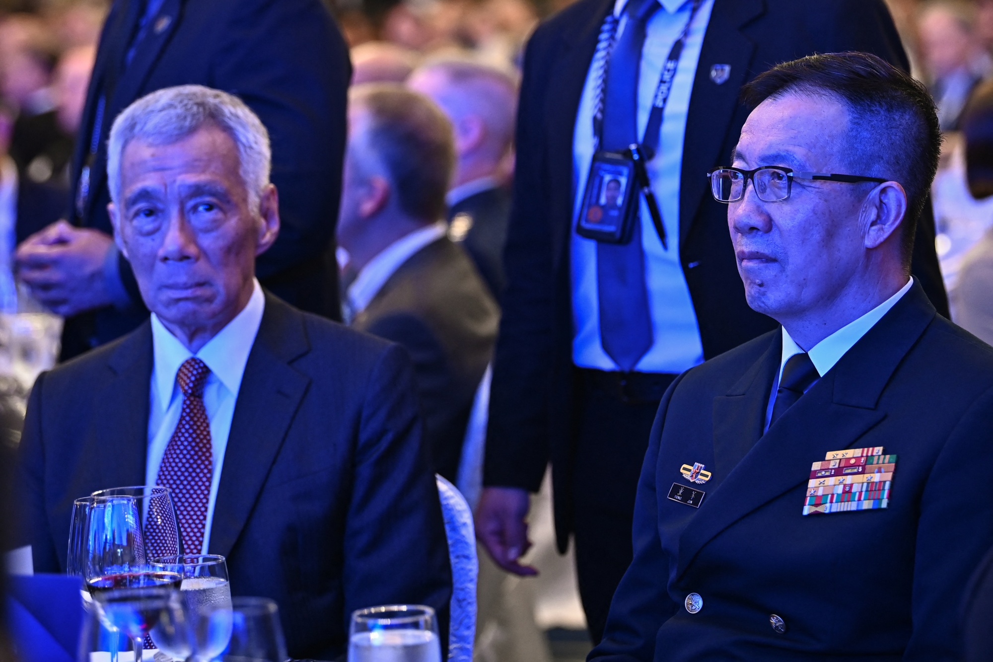 在马科斯讲话时,中国国防部长董军坐在观众席的主席台之一。 美国国防部长劳埃德·奥斯汀坐在马科斯和印尼当选总统普拉博沃·苏比安托之间。