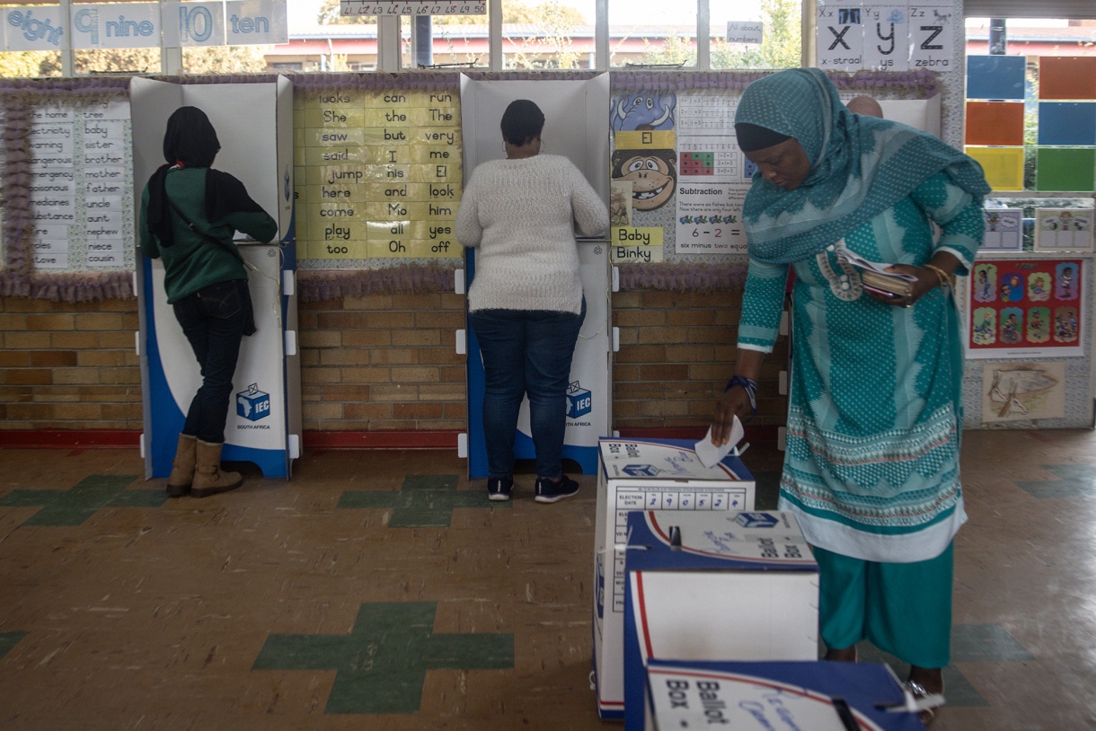 一个女人在南非约翰内斯堡的一个投票站投票,日期是5月29日。