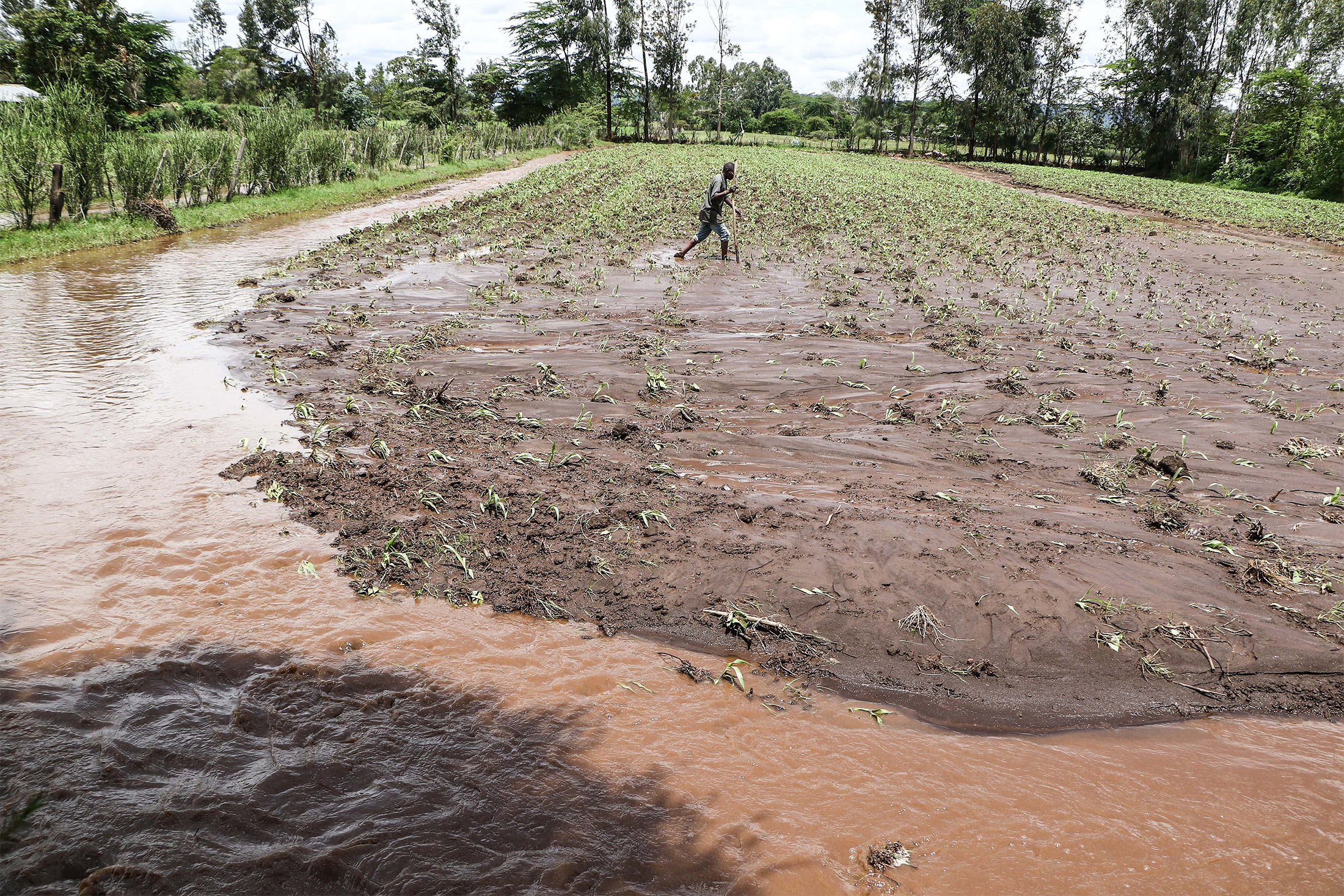 一位农民在2024年5月3日检查了在肯尼亚纳库鲁县被洪水摧毁的玉米作物。