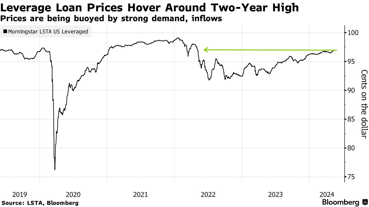 Morningstar LSTA美国杠杆贷款指数的平均价格一直在接近每美元97美分的水平,创下两年来的新高。根据LSEG Lipper的数据,投资者在截至5月29日的一周内向美国杠杆贷款基金增加了超过3.85亿美元。