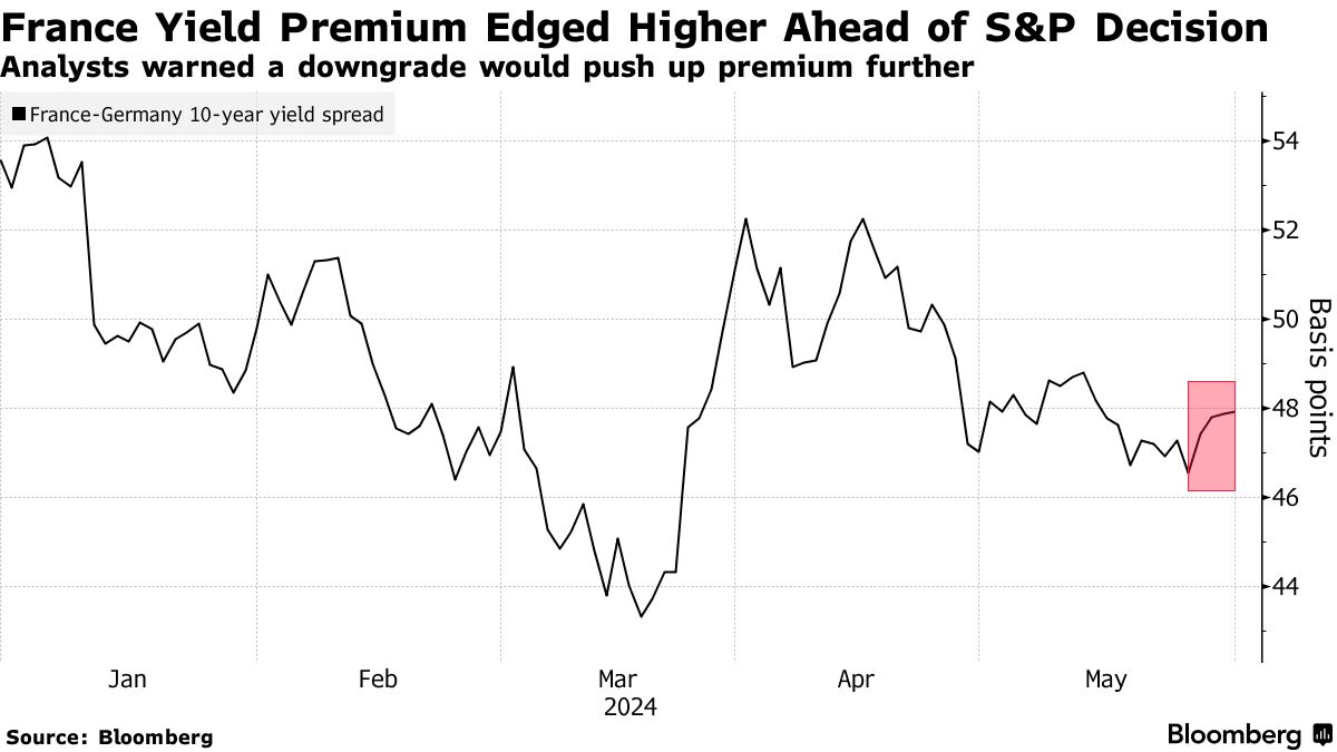 过去一周,标普做出决定之前,这个溢价率上升到了48个基点。瑞穗国际策略师Evelyne Gomez-Liechti表示,一旦降级,可能会抹去自四月以来看到的利差收窄,当时穆迪评级和惠誉评级都重申了他们对法国的立场和展望。