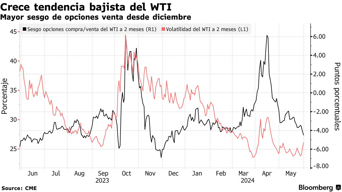 石油本月在一个狭窄的范围内交易,控制着隐含波动率,这是一个指标显示期权交易员预计价格会波动多少。然而,在OPEC+会议前几天,波动性增加,看跌期权偏好或者交易员为看跌美国原油价格而支付的期权溢价已经扩大到自去年12月以来的最高水平。