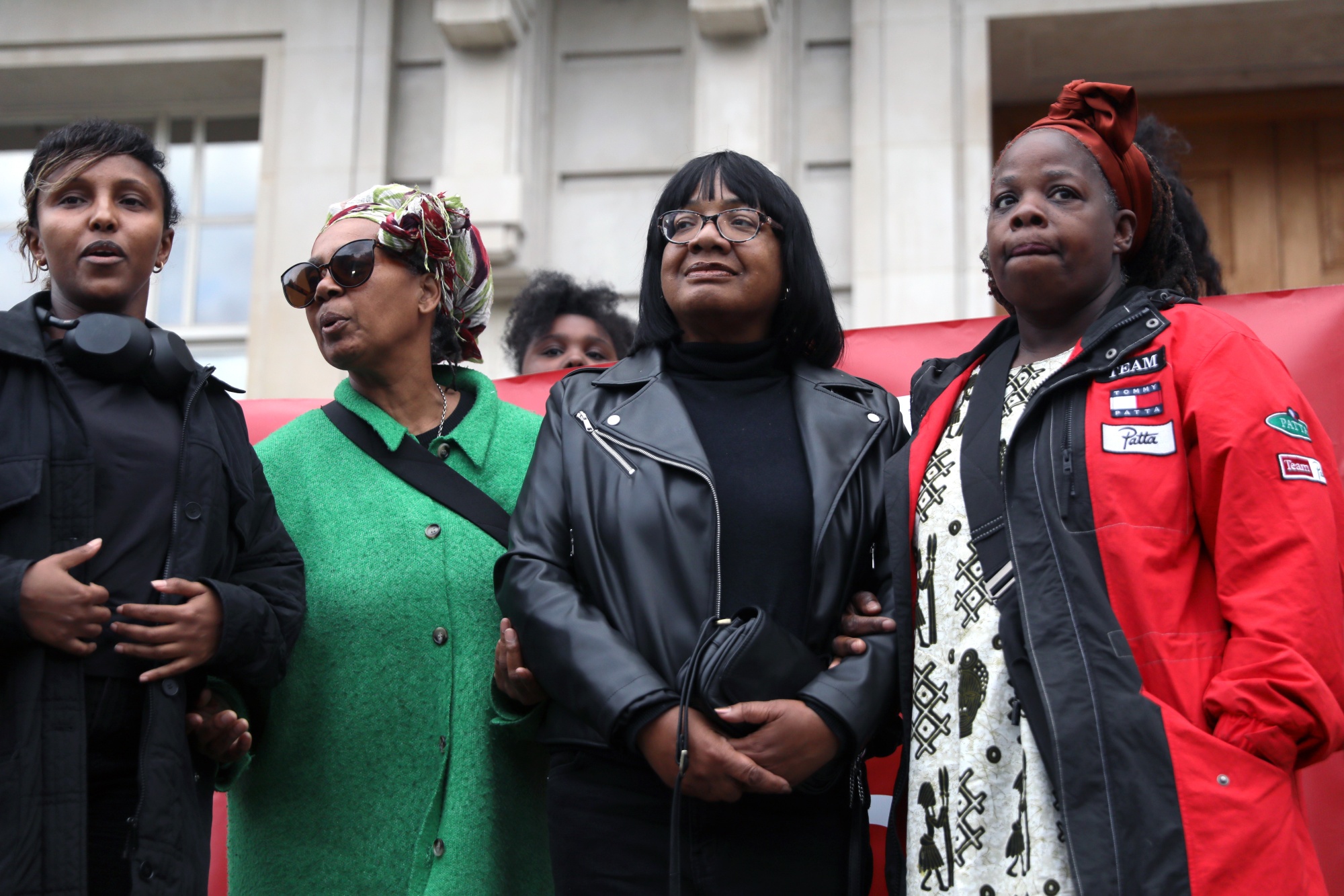 黛安·阿博特(中右)。摄影师:阿丽西亚·阿博顿德/盖蒂图片社正是在候选人选拔问题上的争吵也动摇了工党的开局。尽管斯塔默的盟友们对静态民调感到鼓舞,但他们私下承认,有关对待左翼议员(如第一位黑人女性议会议员黛安·阿博特)分歧的负面头条新闻持续了三天,对其造成了损害。