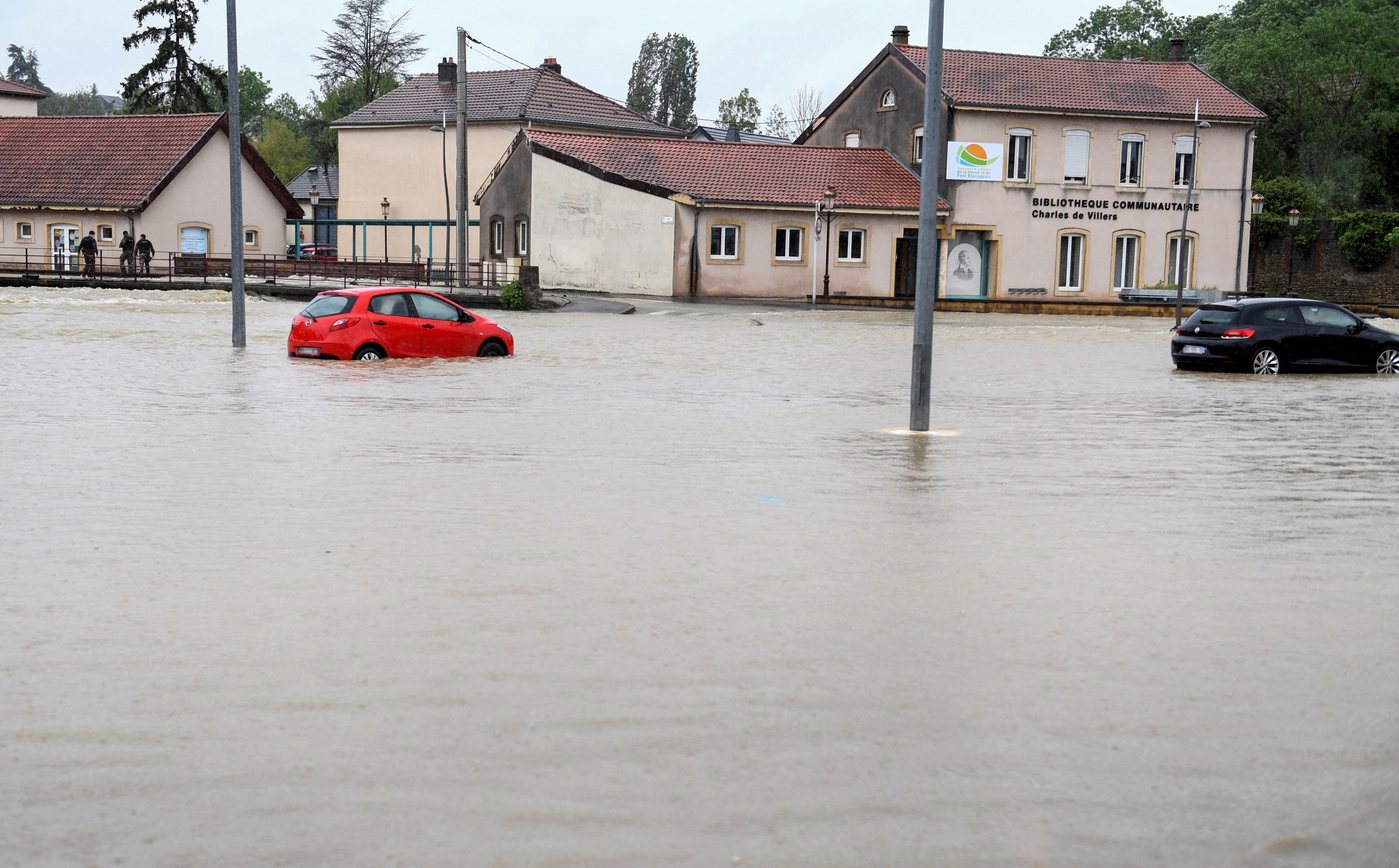 法国布莱-莫泽尔市一条被洪水淹没的街道上滞留的车辆,5月17日。