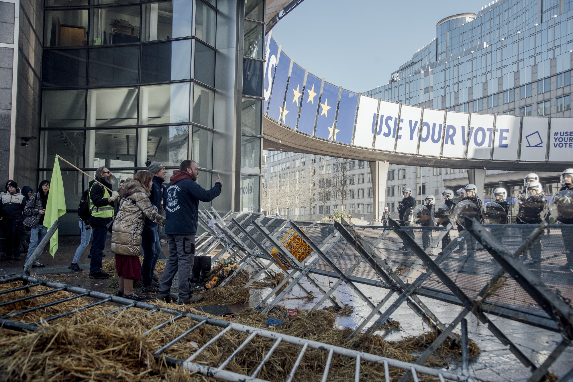 农民在布鲁塞尔欧洲议会外倾倒的干草附近抗议,日期为2月1日。摄影师:Cyril Marcilhacy/彭博尽管民意调查显示主流政党联盟预计将在欧盟议会的下一个五年任期中保持多数地位,但重心正在向右移动。极右翼团体将增加他们的席位,即使他们的崛起在最近几周有所减缓。