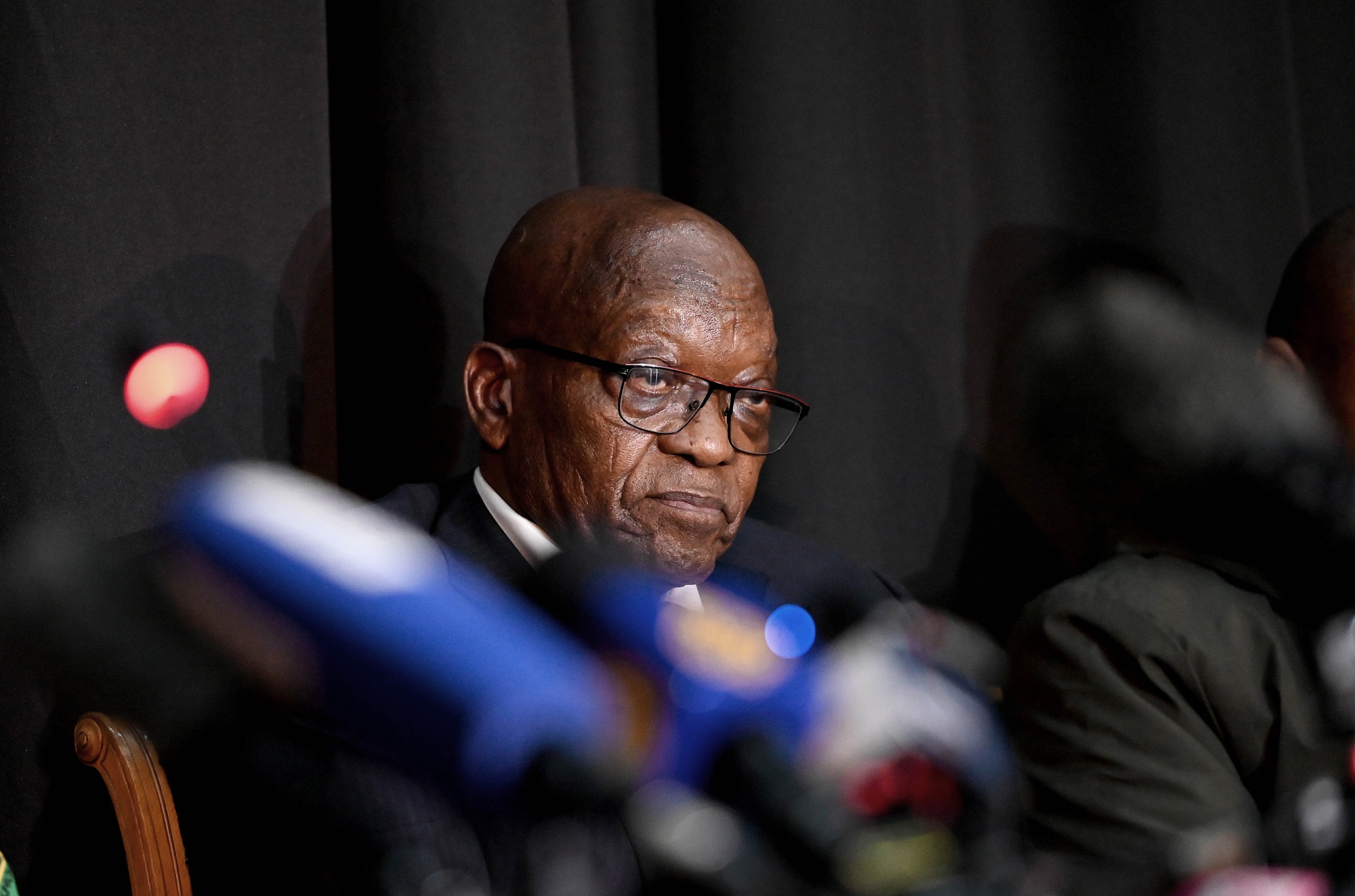 雅各布·祖马,前南非总统,南非人民革命军(MK党)领袖,于2024年6月1日星期六在南非米德兰独立选举委员会(IEC)全国结果中心举行新闻发布会。摄影师:Leon Sadiki/Bloomberg阅读更多:祖马坚持南非选举差异性声明