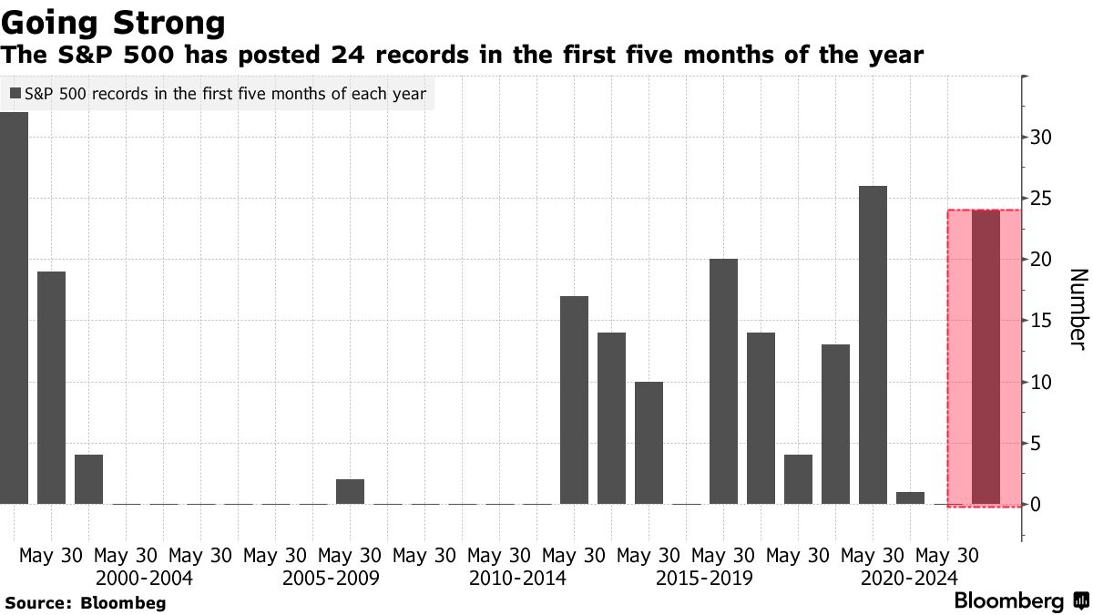 尽管股市最近有所动荡,标普500指数结束了连续五周的上涨,但根据彭博社编制的数据显示,该指数今年已经创下了24个纪录,这使得它成为自2000年以来第二强的1月至5月期间,仅次于2021年。