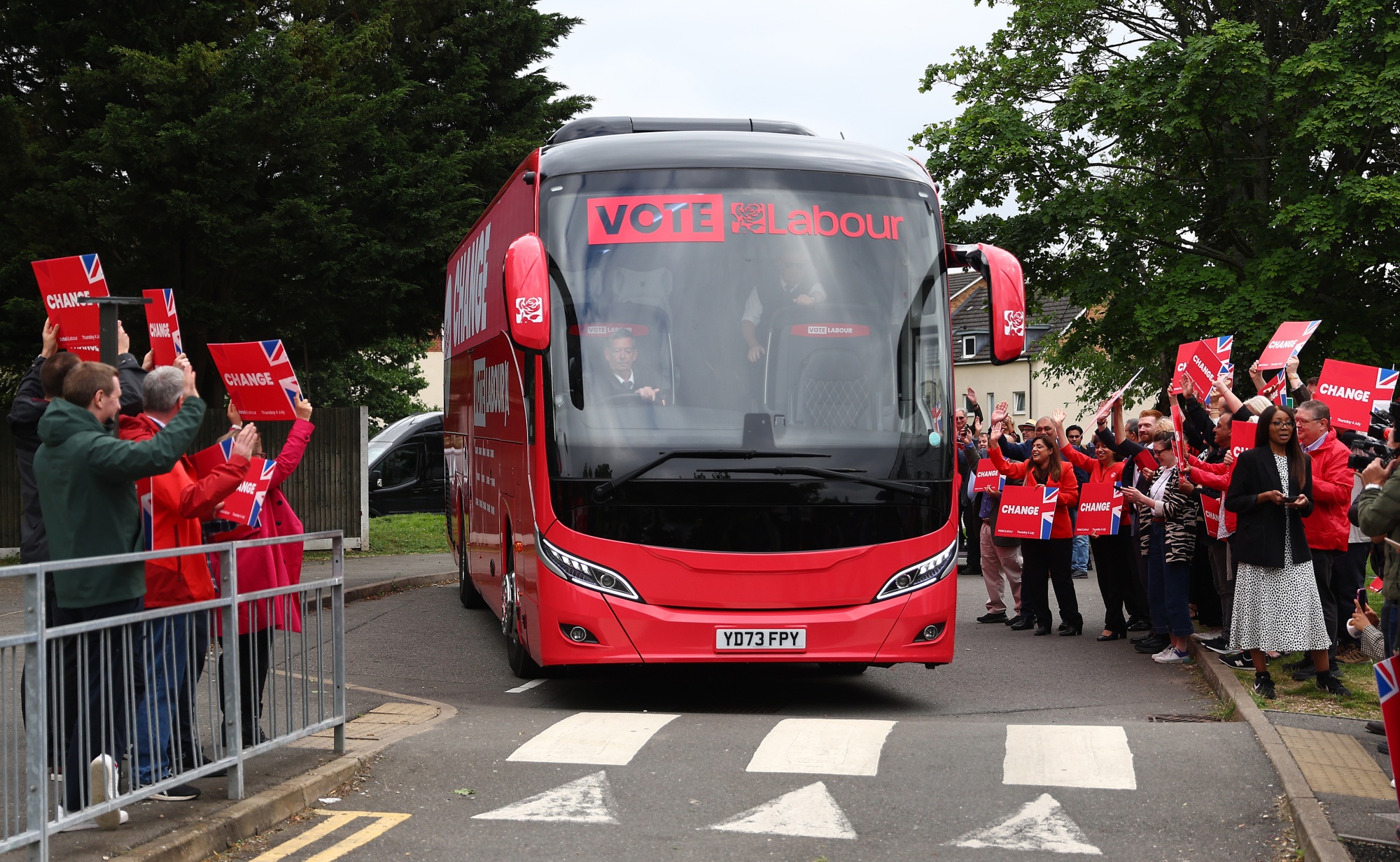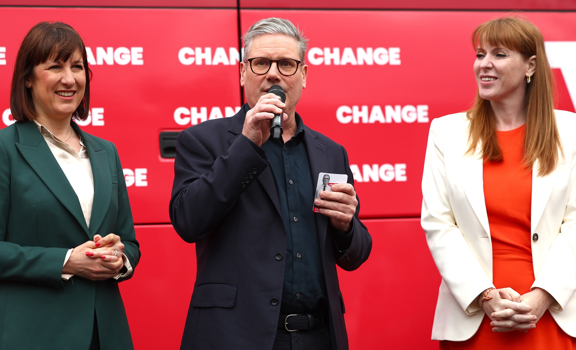 工党领袖基尔·斯塔默与影子财政大臣瑞秋·里夫斯和副工党领袖安吉拉·雷纳并肩站在一起,没有承诺乘坐这辆将行驶5000英里的巴士,而是派遣雷纳去说服选民支持工党。