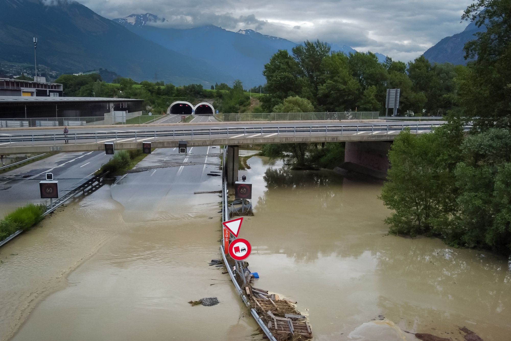 6月30日,瑞士西部锡耶尔附近的A9高速公路部分被洪水淹没。