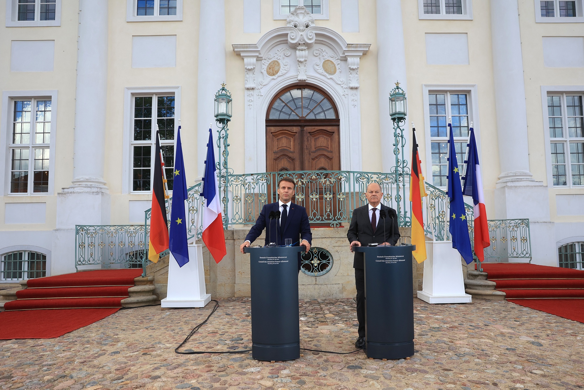 埃马纽埃尔·马克龙和奥拉夫·肖尔茨在梅泽贝格。照片:Krisztian Bocsi/Bloomberg在德法部长理事会开幕新闻发布会上,对于一名德国记者的提问,埃马纽埃尔·马克龙毫不隐瞒地承认,乌克兰将来也可以使用西方武器来摧毁靠近俄罗斯边境的火箭发射点。为此,法国总统甚至向摄像机展示了一幅放大的地图,以说明俄罗斯士兵如何从俄罗斯多个据点攻击乌克兰争议城市哈尔科夫。