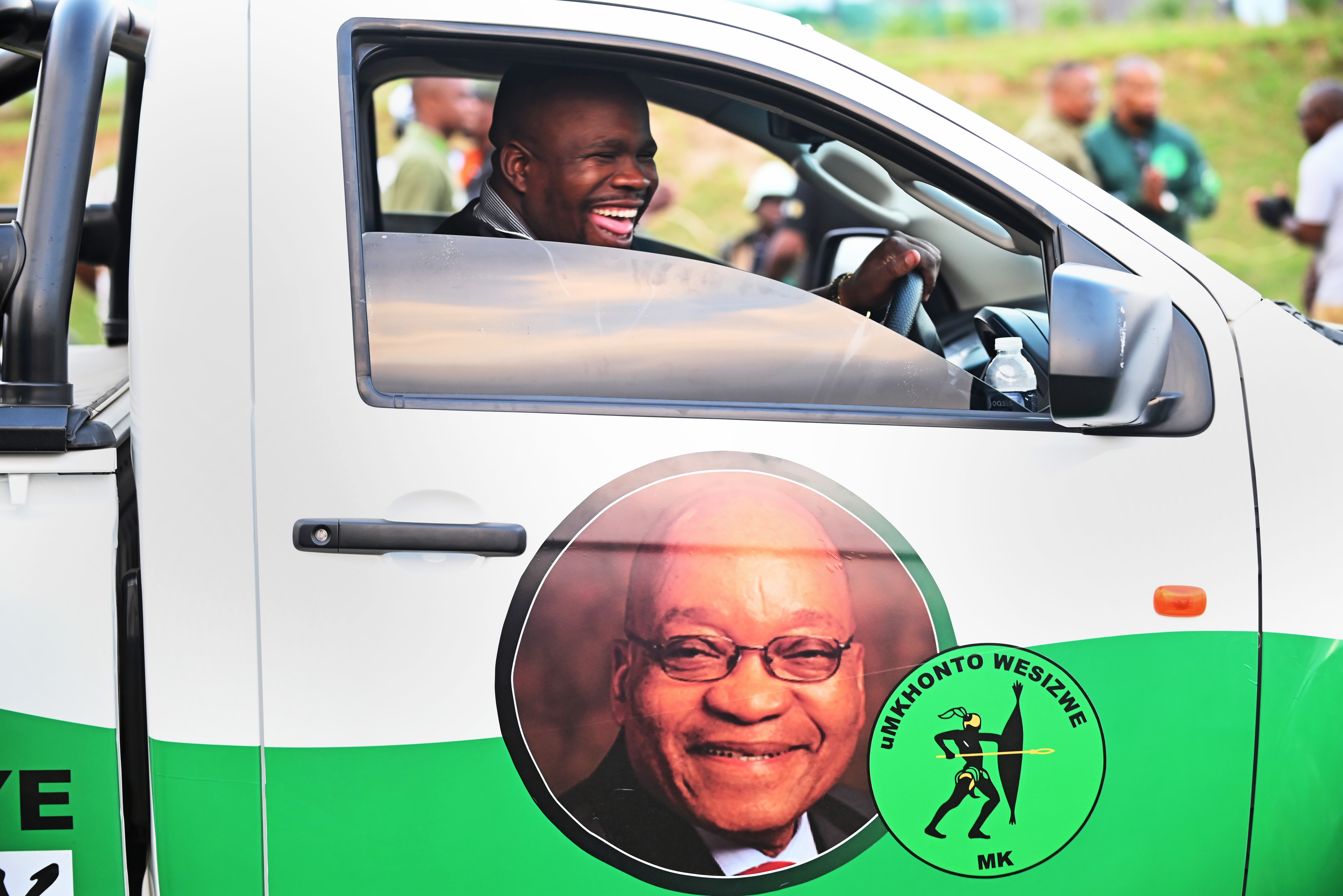 一个印有uMkhonto weSizwe Party标志的卡车。摄影师:Leon Sadiki/Bloomberg在非洲国民大会威胁弹劾下,祖马在执政近九年后于2018年被迫辞职,由新领导人西里尔·拉马福萨取代他。